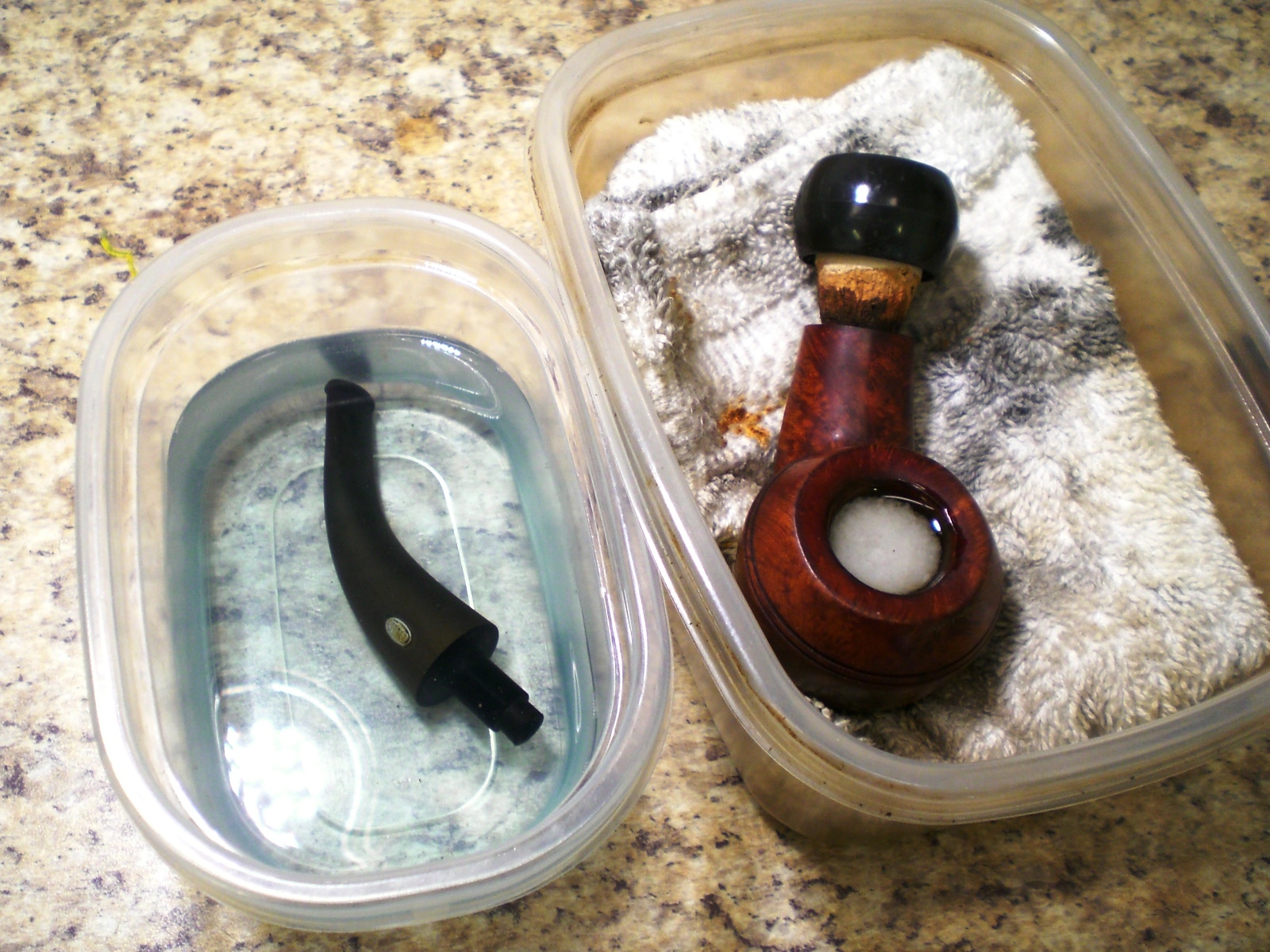 I gently reamed the bowl, being careful to not damage the meer lining. I wanted to take the cake back as far as possible with the reamer and would do the rest with sandpaper. I sanded the meer lining with 220 grit sandpaper until the entire cake was gone and the meer was once again smooth. It was darkened and would not be white again do to use. I gently topped the bowl with a topping board to remove the cake and smooth out the rim damage before working on the rest of the bowl. I wiped the bowl down with acetone on cotton pads, carefully avoiding the meerschaum lining on the top of the rim. The acetone removed the grime and the spotty stain on the bowl and would form the base for restaining the bowl later.