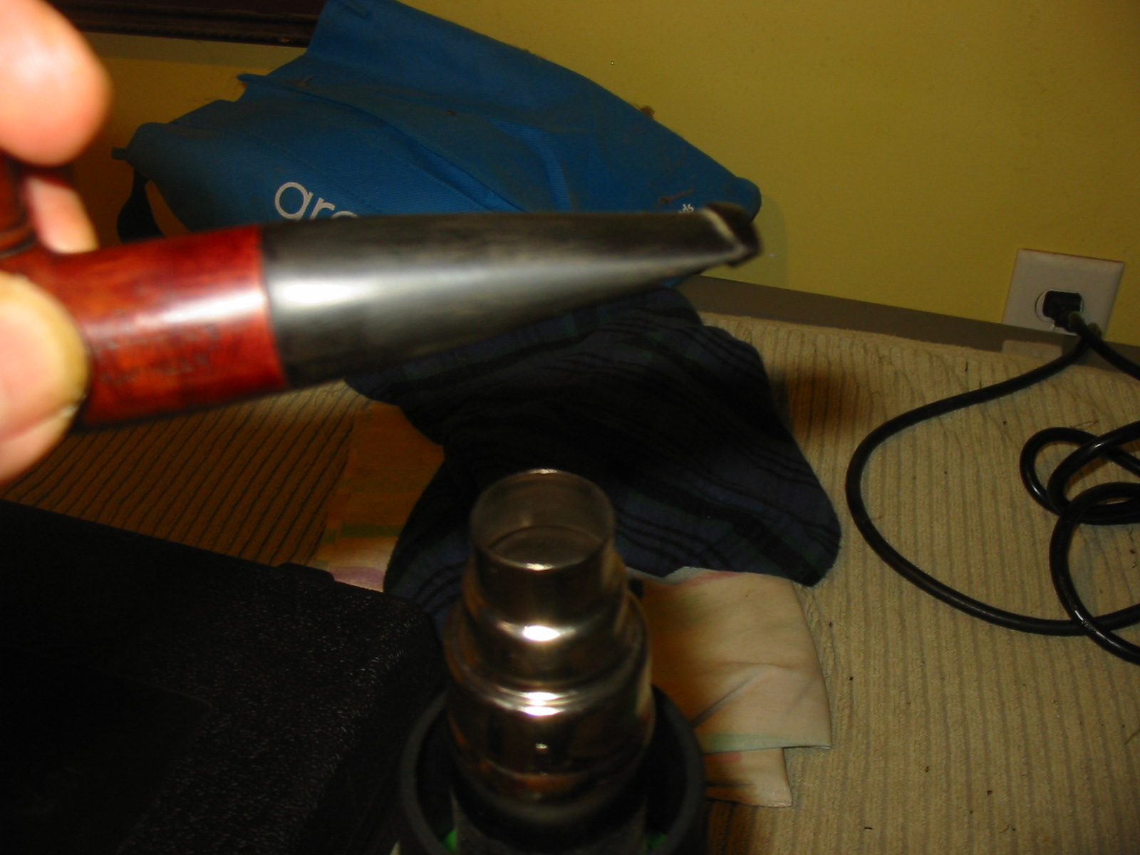 When the stain had dried I buffed the bowl with White Diamond and then gave it a coating of carnauba wax to seal it and give it a shine. I had done enough of the early sanding on the stem by that point to set up a heat gun to heat and bend the stem. I held it over the heat until the stem was soft and then bent it over a rolling pin that I use for bending stems. I have a thick cardboard tube that I slide on the rolling pin to provide a softer surface than the old rolling pin when I am bending the heated vulcanite.