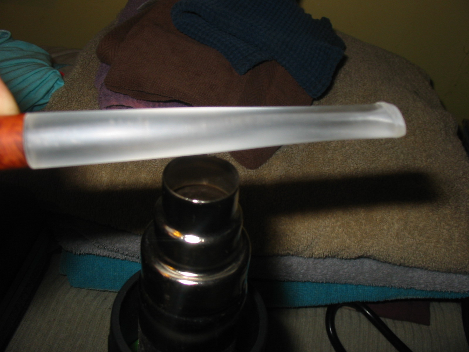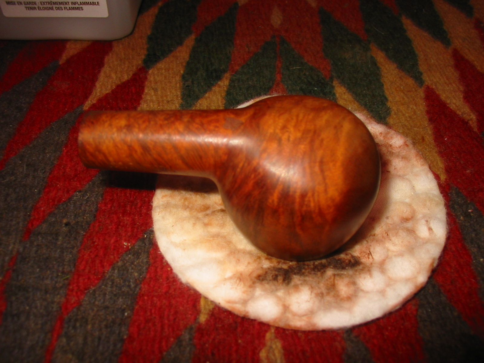 I buffed the pipe and stem with White Diamond to raise the shine. I put cotton balls in the bowls of the prince and the other Television pipe and used an ear syringe to put isopropyl alcohol in them to draw out the tars and oils of the tobacco. I set them in an old ice cube tray overnight. In the morning the alcohol had drawn out a lot of oils and the cotton was dark. I removed the cotton and cleaned the bowl and shank with cotton swabs and pipe cleaners.