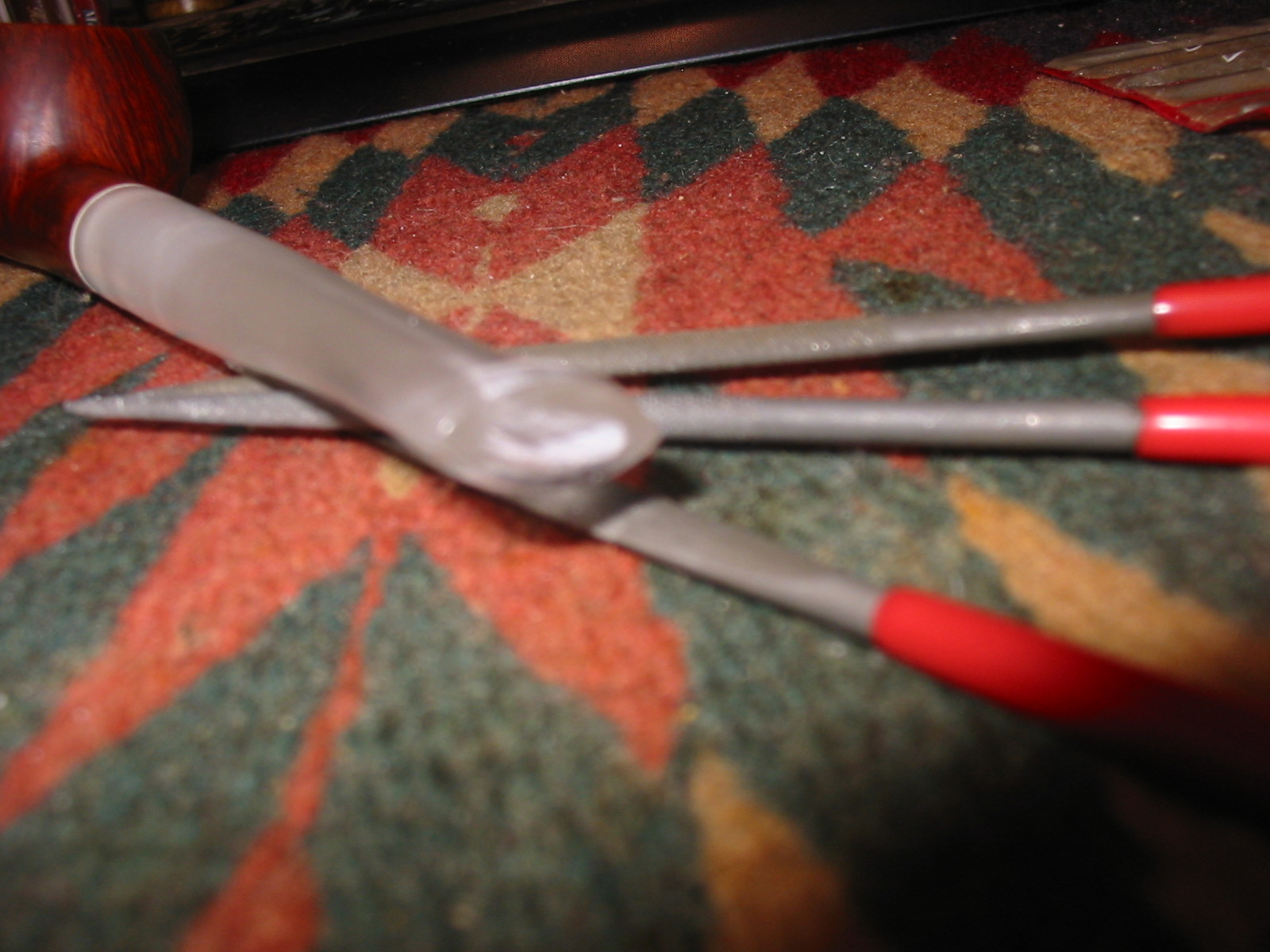 The Lucite stem did not have a slot carved in the end – merely a drilled airway so that I would need to use needle files to open and shape it into a funnel. The next four photos show the progress of the shaping of the slot. I apologize for the blurriness of the last two photos but they do give a rough idea of the shape of the slot at this point.