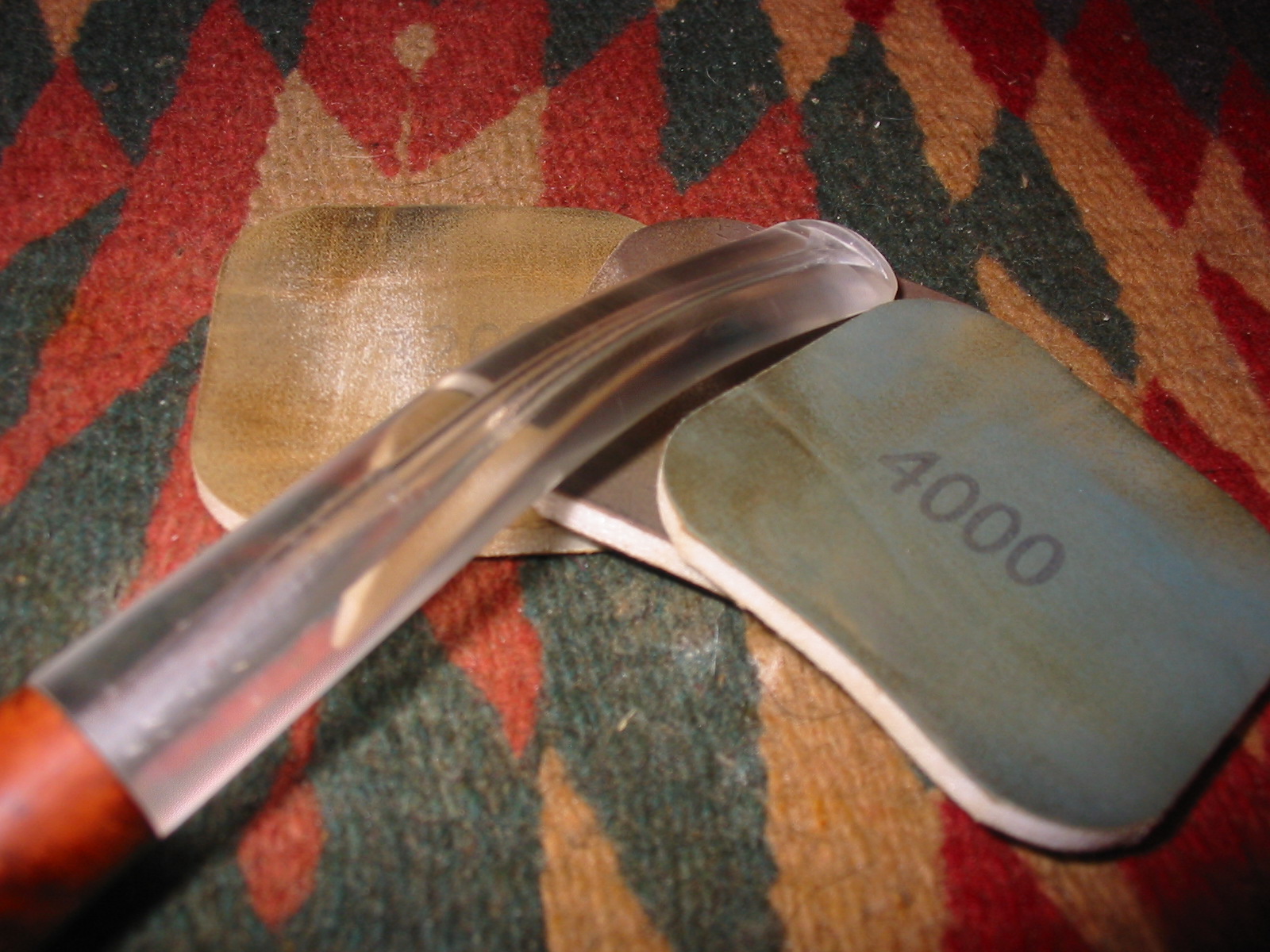 I sanded the stem to thin it on the top and on the underside of the bend with 220 grit sandpaper and when it was an even taper I sanded it with medium and fine grit sanding sponges. I sanded with my usual array of micromesh sanding pads – wet sanding with 1500-2400 grit pads and dry sanding with 3200-12,000 grit pads.