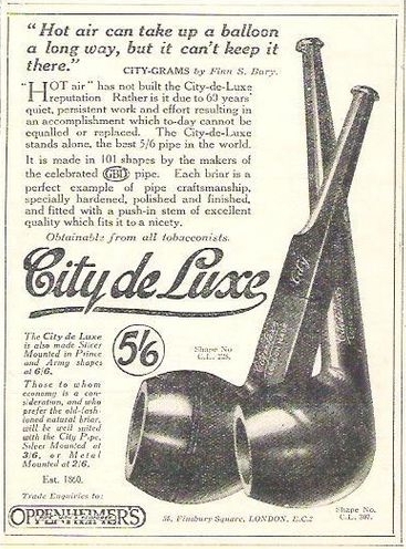 We cannot leave GBD without mention of an important line just below the GBD quality — often referred to on the French market as the ‘petite’ GBD — the ‘City de Luxe’ range first registered in 1922. The distinctive metal star on the mouthpiece was introduced at the same time as the GBD inlay. ‘Citys’ are made in both London and France.
