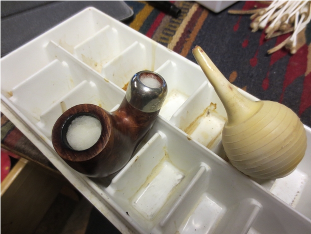 The bowl and shank had a heavy aromatic tobacco smell so I stuffed them both with cotton balls and used an ear syringe to put alcohol in both the bowl and shank. I set the bowl upright in an ice-cube tray and let it sit while the alcohol and cotton wicked out the oils and tars and sweetened the pipe. By doing this the pipe would be reset and could be smoked with any tobacco without picking up residual tastes.