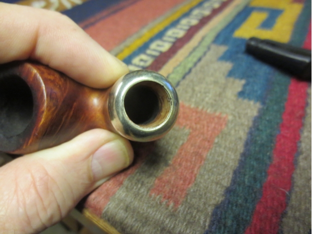 The bowl had been wiped clean and had no cake inside. The rim was dirty and darkened with a thin buildup of carbon and oils. The inside rim was clean and the bowl was in round. There were no serious nicks in the bowl edges. The nickel band was polished and undented. The stem was lightly oxidized and had a light tint of brown. There were no tooth marks or bite marks on the stem. The pipe was in good shape and would be one of my easier clean ups. The inside of the shank and sump had a lot of tars built up inside. The airway was also dirty. The seller had used silver polish on the ferrule and there was a white buildup on the inside edges of the shank.