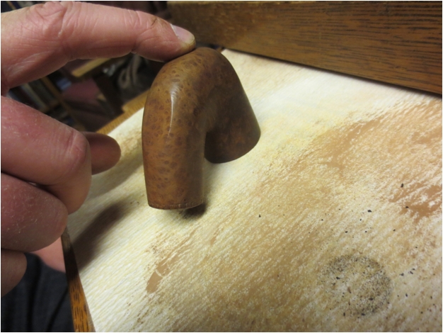 Lance worked on the bowl while this was going on. He washed down the bowl with acetone on cotton pads to remove the grime and the remaining finish on the pipe. He softened the buildup on the rim surface and then lightly topped the bowl to remove the damage and the buildup. Once it was smooth, he sanded it with a fine grit sanding sponge and then wiped the bowl down with another wash of acetone.