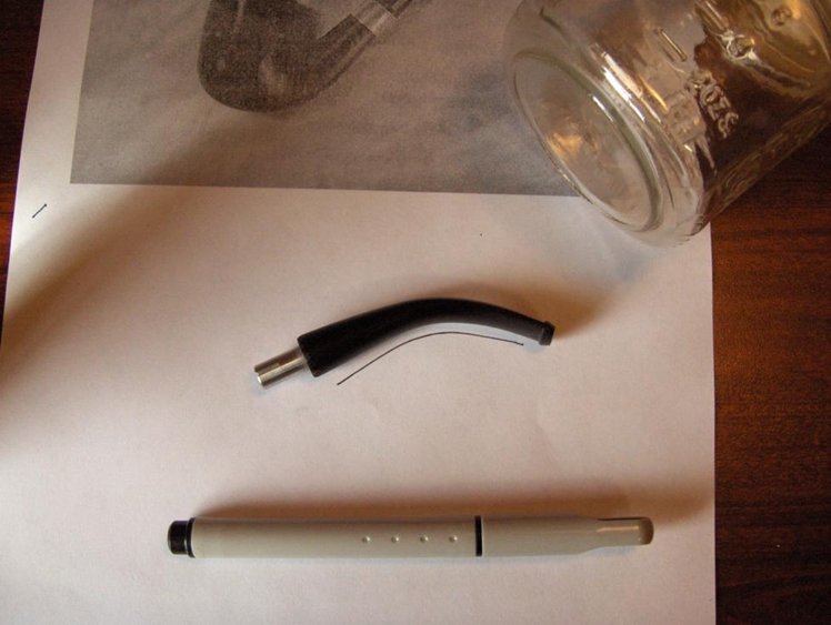 Most bent stems like this one tend to straighten out at least a little during heating. So, before I begin, I print a photo reference of the stem, trace the inside edge of the bend on paper, and find a hard, smooth, rounded surface that fits well inside the bend. If it’s required, I’ll grasp both ends of the pipe cleaner and bend the warm, pliable stem over the rounded surface and let it cool for a few seconds. Then, I set it with cold water, wipe it dry and compare it to my tracing. If it’s still off a bit, it usually takes only a couple of minutes to reheat the stem enough to give it another try. The following picture shows the stem after heating and re-bending.