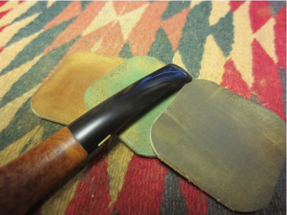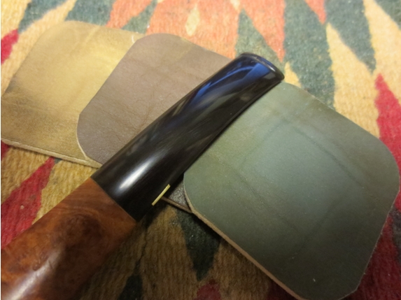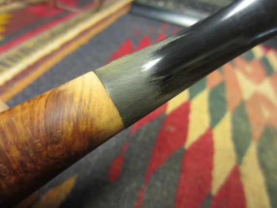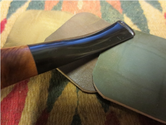 With the bowl in good shape, I started work on the stem. I used 400 grit wet/dry sand paper with water to remove the minor tooth marks and oxidation. I then used 1500-2400 grit micro mesh pads with water. Next I re-assembled the pipe with a rubber washer between the stem and shank to prevent rounding the end of the stem. I finished the stem with micro mesh pads, 3200-12,000 grit, followed by white diamond and carnauba wax using the rotary tool on low speed.
