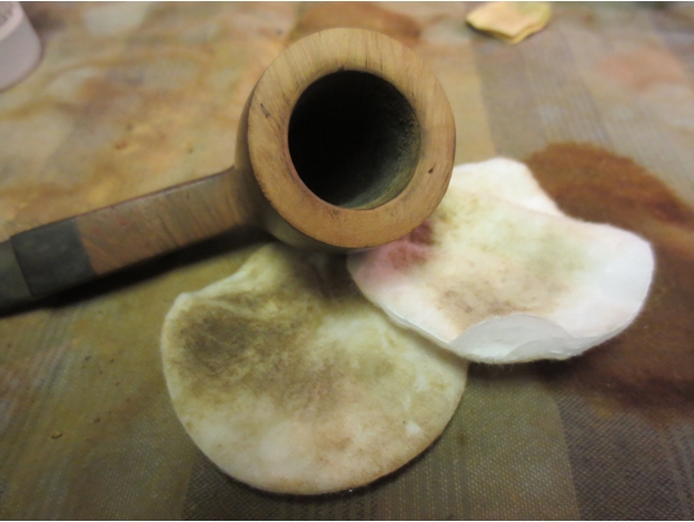 I scrubbed the bowl down with acetone on cotton pads to remove the grime that had been rubbed into the bowl sides and shank. There were a few fills present but I figured that once I oiled the bowl these would blend into the reddish finish of the briar.