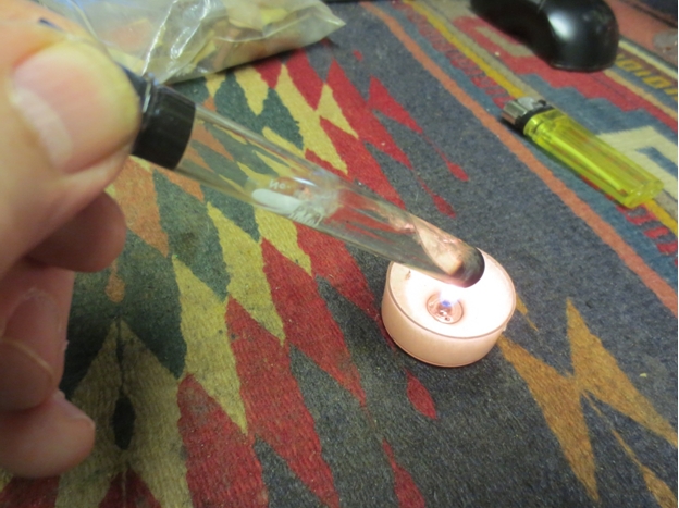 I set up the retort using a jar to lift the pipe up above the flame of the candle I used to heat the alcohol. I filled the test tube 2/3 of the way full with isopropyl alcohol and inserted the rubber stopper in it. I pulled the surgical tubing over the end of the stem and put a cotton ball loosely in the bowl. I heated the alcohol over the candle flame until it boiled through the shank and bowl. I changed the alcohol four times before I was able to get the shank clean and the alcohol coming out clean.