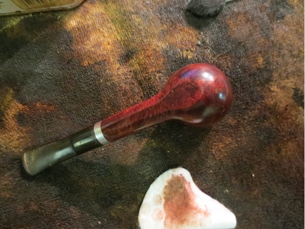 I decided to stain the bowl and rim with a oxblood stain. I applied it to the pipe with a cotton pad and then flamed it to set it in the grain. I reapplied it until I had the coverage I wanted with the colour.