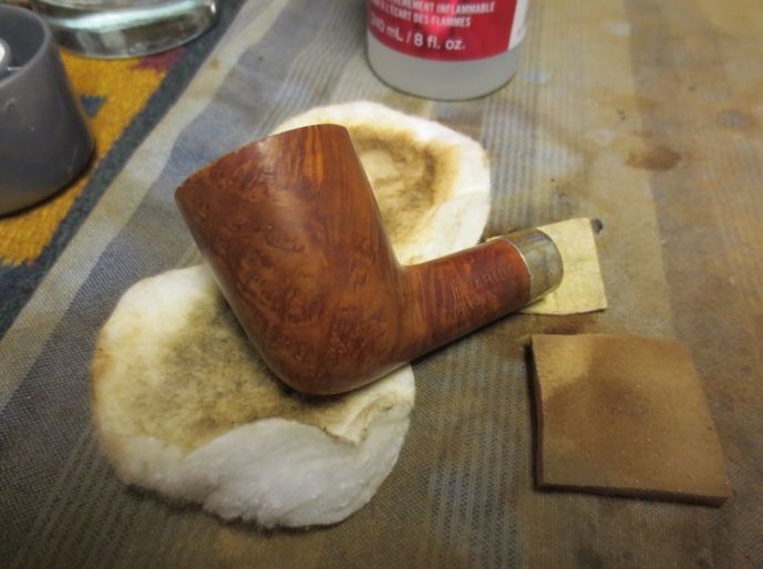 The challenge with a chamfered rim is that you cannot top the bowl without seriously damaging the inward cant of the rim toward the bowl. I scrubbed the rim with acetone on cotton pads and then sanded it lightly with 220 grit sandpaper and then a medium and fine grit sanding sponge to remove the tars. When I had finished removing the build-up on the rim I also scrubbed the bowl with acetone to remove the varnish coat.