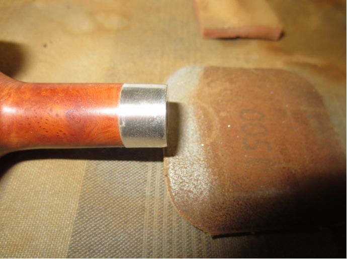 The yellow tinge to the silver band seemed like it also was varnish that had peeled and bubbled. I scrubbed it with the acetone as well to soften it and then used a 1500 grit micromesh sanding pad to polish the silver and remove the varnish and build-up. I then used silver polish to further polish the silver and remove the small scratches left behind by the micromesh. On the top side of the band/mortise insert it is stamped Sterling Silver in script at an angle across the surface of the band.