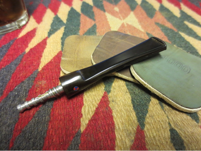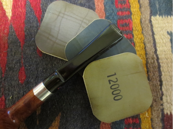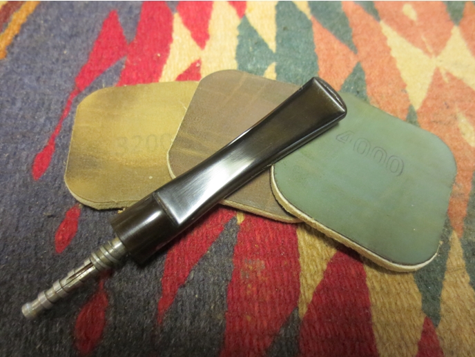 With the bowl finished to this point I turned to work on the stem. I used a Bic lighter to paint the flame over the surface of the vulcanite to lift out some of the tooth chatter and to raise the oxidation to the surface. I then sanded it with a medium and a fine grit sanding sponge, wiped it down with a cotton pad and painted it with the flame yet again. When I had finished that the majority of the oxidation was gone. I polished the stem with micromesh sanding pads. I wet sanded with 1500-2400 grit sanding pads and then dry sanded with 3200-12,000 grit pads. I rubbed the stem down with Obsidian Oil between each set of three pads. After the sanding with the 6000 grit pad I buffed the stem with White Diamond and then brought it back to the work table and sanded it with the 8000 and 12,000 grit pads.