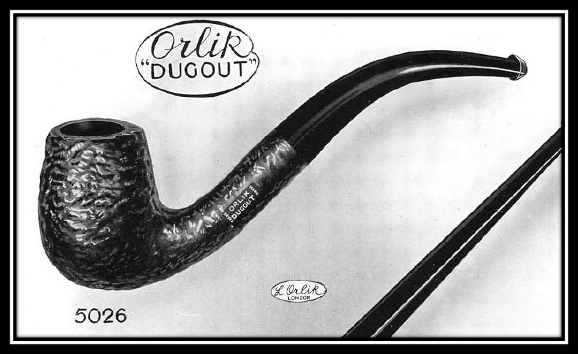 Dugout: Introduced about 1921 (see attached trademark registration for U.S. market); their earliest known sandblast, presumably a response to Dunhill; advertised to be “light as a feather”; priced at the top of Orlik’s line, along with the Bruyere Antique; in production through about 1941 (although it was briefly revived much later)