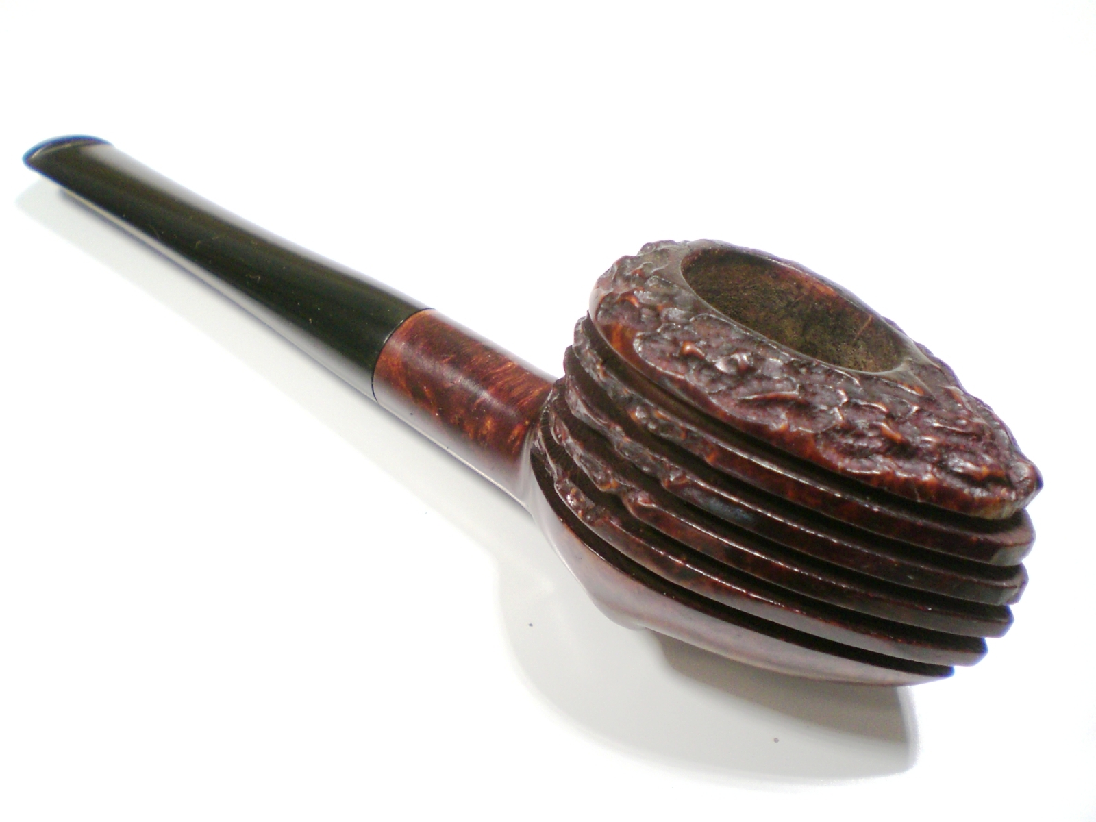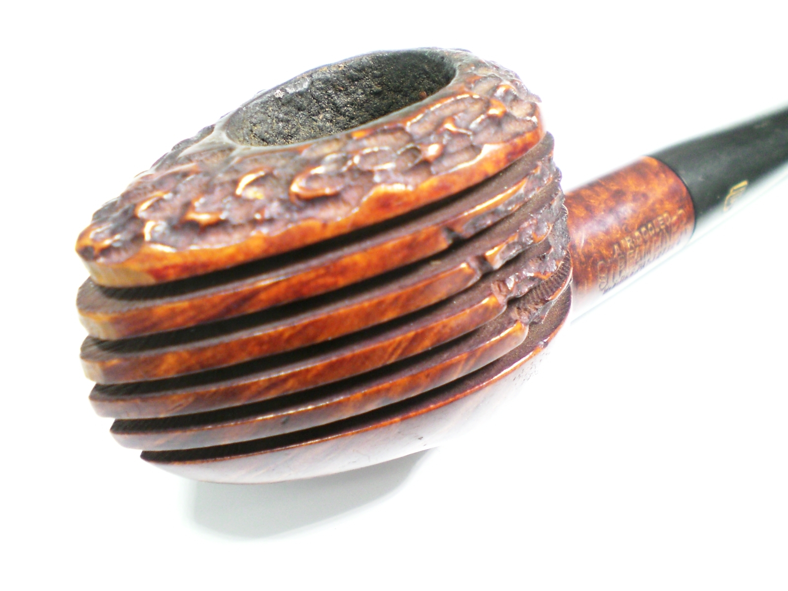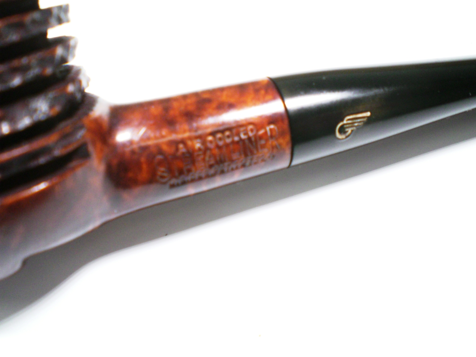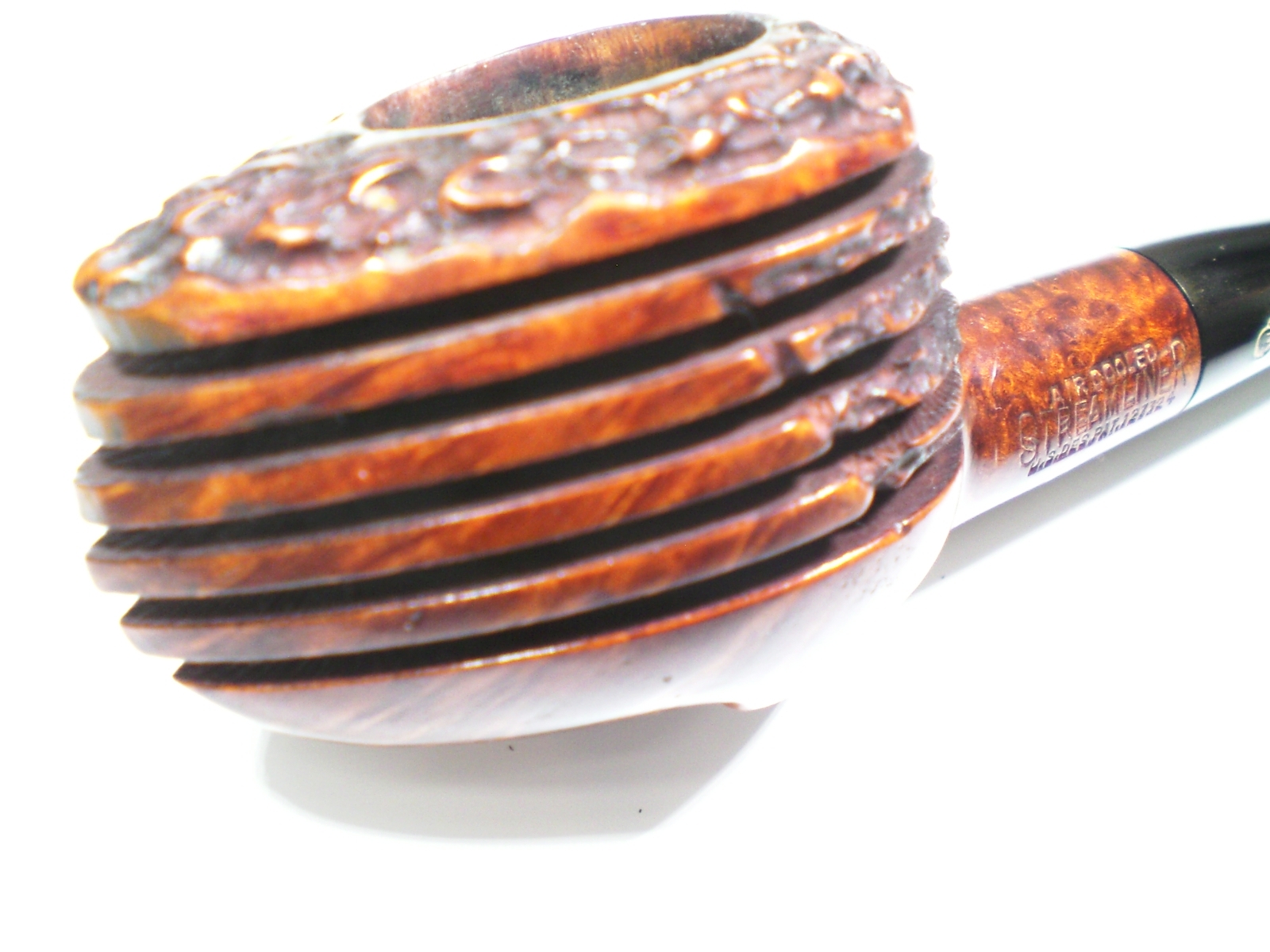 The strakes looked so fragile, I thought the briar would best be polished by hand with some Halycon wax. This turned out to be good move as during that process, a small piece of one strake broke off. I usually examine a fragile pipe like this with a jewelers loupe and look for damaged areas. In this case, I didn’t go downstairs to my pipe bag and get the loupe. So, I can’t say if it was damaged or my cloth pulled the piece loose. Fortunately, it was a clean brake and the piece fit back in nicely and I used some wood glue to make the repair. It is almost invisible. You can just make out the crack line on the top strake, near the right hand side.