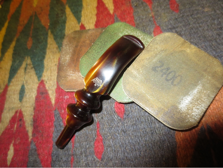 When the stem patches where dry I sanded them down with 220-grit paper, and used 320-grit and 400-grit to blend them into the rest of the surface and to shape the button. Then, I lightly sanded the entire stem with 600-grit paper to remove any scratches and pits in the vulcanite. I also used a grout pen to paint in the stamped logo. Some of the logo area had been worn smooth over time. So, the resulting logo didn’t look as good as the example over at PipePhil.eu, but I think it looks better than it did originally.