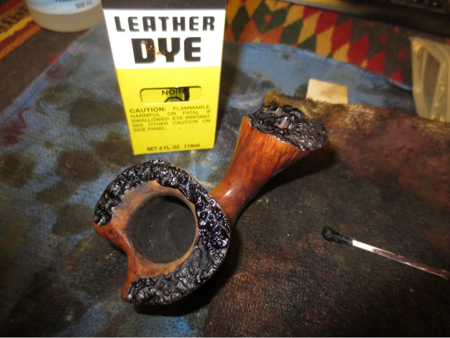 I had been experimenting with pre-staining briar dust for patches and fills, but I hadn’t had the opportunity to put it into practice until this pipe. I dripped a couple of drops each of Fiebing’s black and oxblood into a bit of briar dust, and then added a few drops of isopropyl alcohol to spread it evenly. After mixing it up and sitting it under a warm lamp for about 30 minutes, I had a batch of stained briar dust.