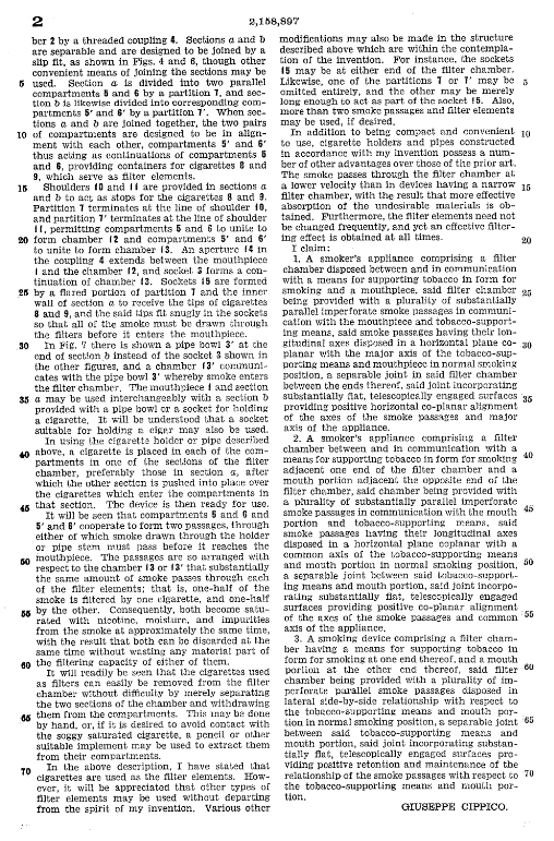 I entered the patent number 2,158,897 and was immediately given a three page scan of the documents on the site for that number. I have included all three pages below. The first page is a series of conceptual drawings of the device. The second and third pages are the details linked to the Figure numbers in the drawings. It was filed May 21, 1937 by a G. Cippico in the category of Smoking Device. G. Cippico is later shown to be Giuseppe Cippico, Inventor from Rome, Italy. The patent was granted on May 16, 1939 almost two years later. These old Patent details are always an interesting read to me. The theory of how the pipe would work is spelled out and the rationale for it being a new and better pipe is detailed.