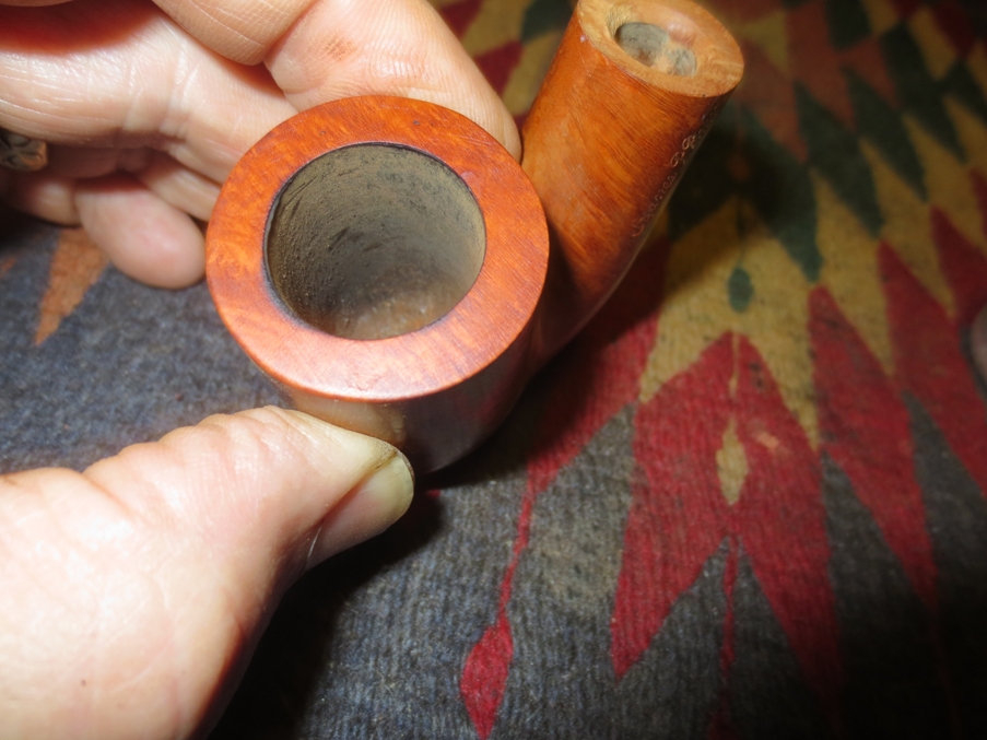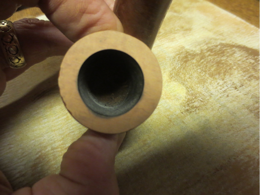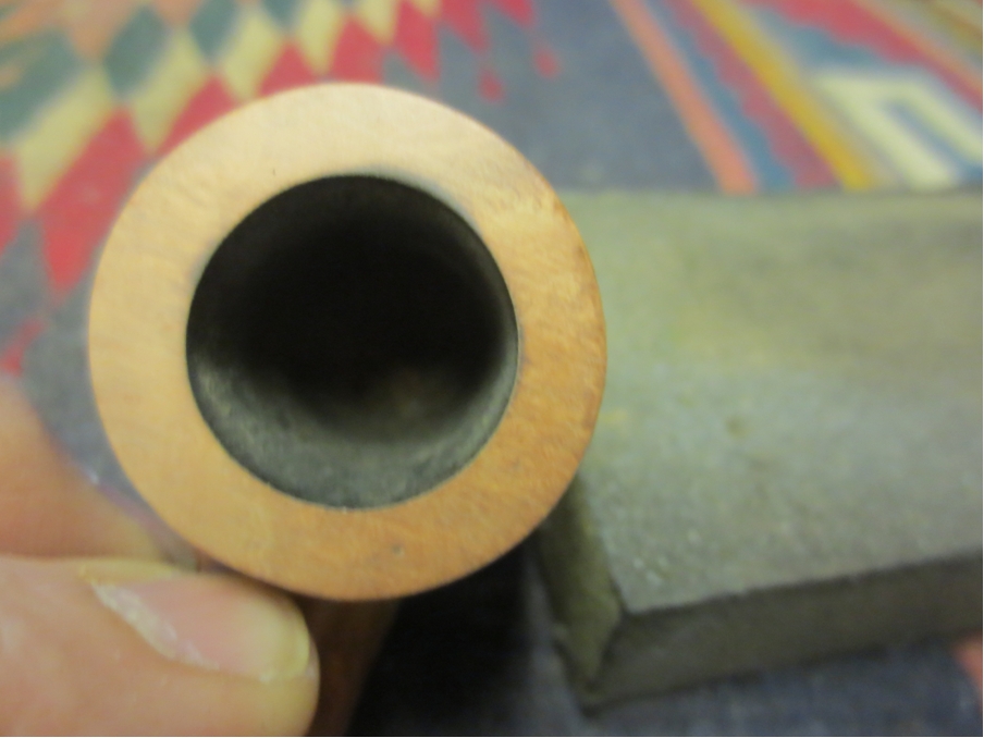 With the rim top cleaned and repaired I worked on the inner edge of the rim with a folded piece of sandpaper. I beveled the inner rim edge inward to compensate for the burned area on the front of the bowl. Then I washed down the bowl with alcohol on cotton pads to remove the wax and the grime on the briar. I scrubbed the inside of the bowl with cotton swabs and alcohol to clean up the debris in the bowl and the dust from sanding. I cleaned out the shank and mortise with pipe cleaners, cotton swabs and alcohol until the cotton swabs came out clean and the mortise was clean to sight. I followed up that by sanding the rim with a medium and fine grit sanding sponge and then with 1500-12,000 grit micromesh to polish it. The beauty of working with natural briar finishes is that when a bowl is topped it is not hard to match and blend into the finish of the bowl.