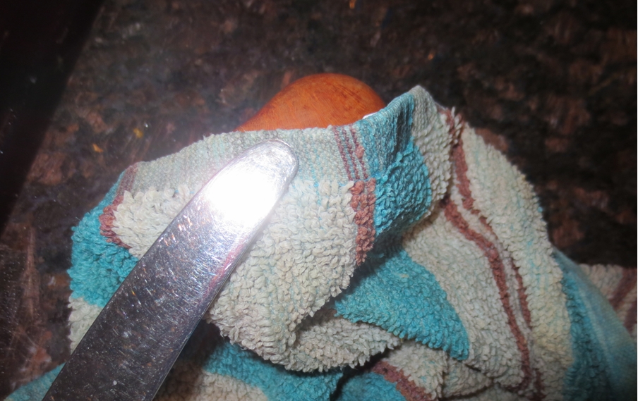 The damage to the outer rim of the bowl needed to be addressed. I was able to stem the flat surface and lift some dents but the outer edge dents were actually cuts and they did not move. I decided to top the bowl lightly to remove the damage to the edges – both the outer right front and the inner front burned area. I set up a topping board with 220 grit sandpaper and took down the top until the damage was minimized. I then sanded the outer edge with a medium grit sanding block to dull the sharp edge slightly. I worked on the inner rim with a folded piece of 220 grit sandpaper to bevel the edge slightly and minimize the damage from the burned area.