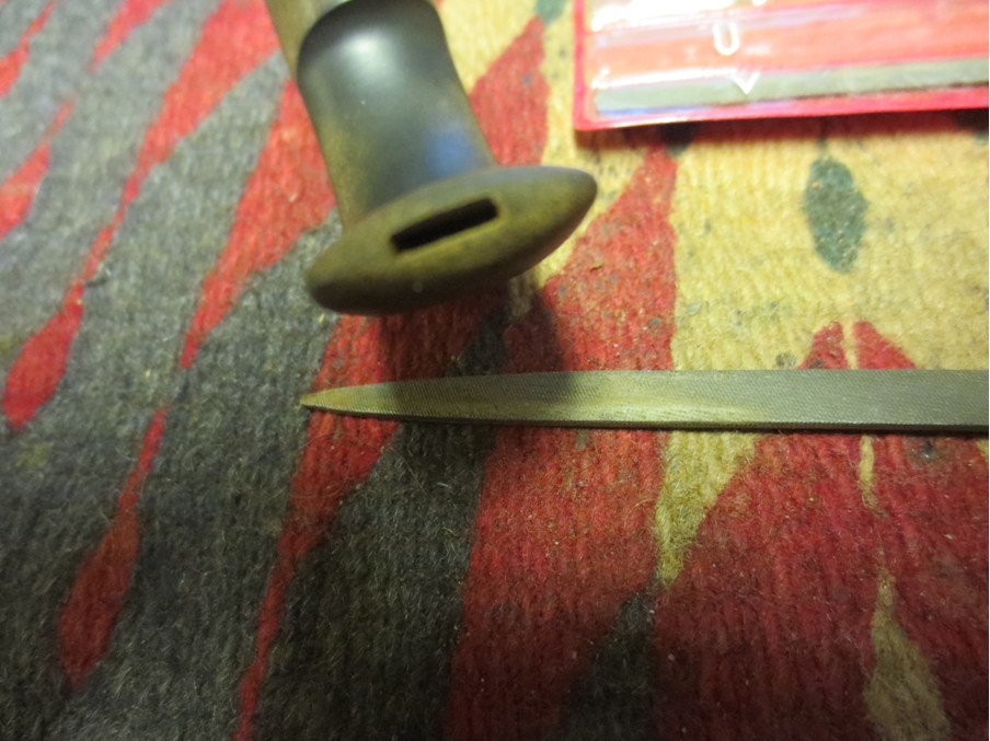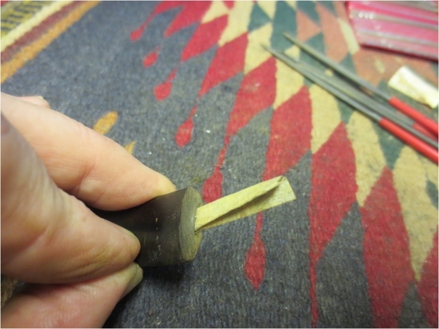 I worked on opening the slot in the button. I used a combination of needle files to open the slot. I began with a flat blade file to widen the slot on the top and bottom. This is tedious work but it pays off dividends in the end. Once I had that area more open I worked on the sides of the slot with a flat oval file to create a Y shape in the slot. I then used a fat oval and a round needle file to open the slot further and round out the ends of the slot. When the filing was completed I folded a piece of sandpaper and worked on sanding the inside of the slot smooth and removing all of the file marks.