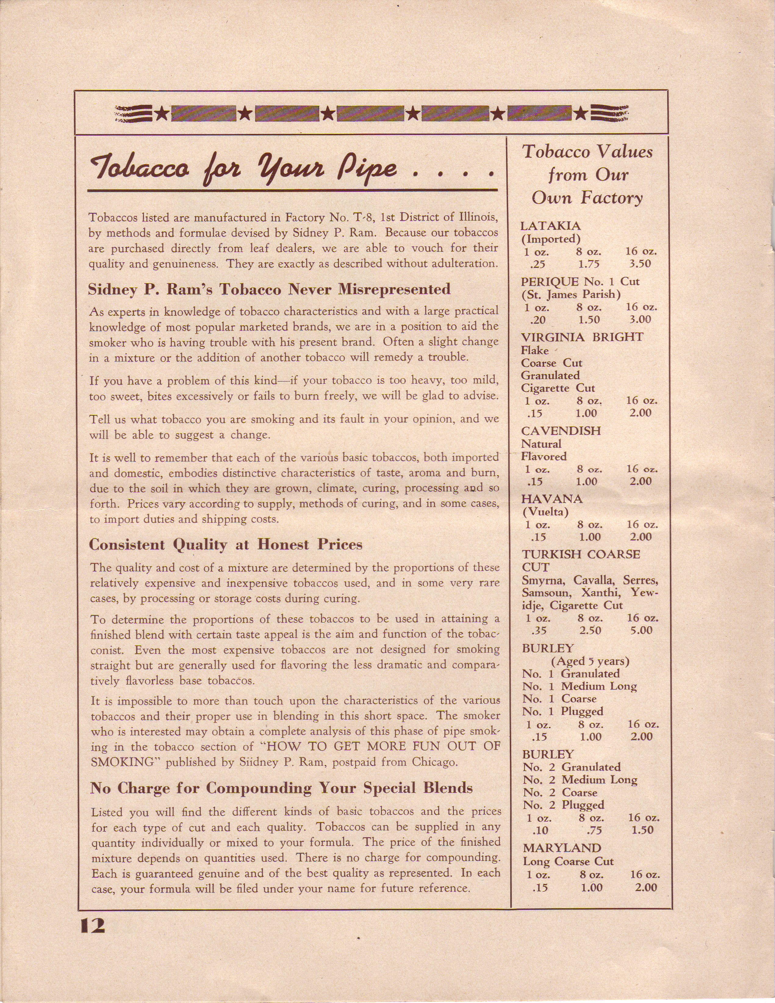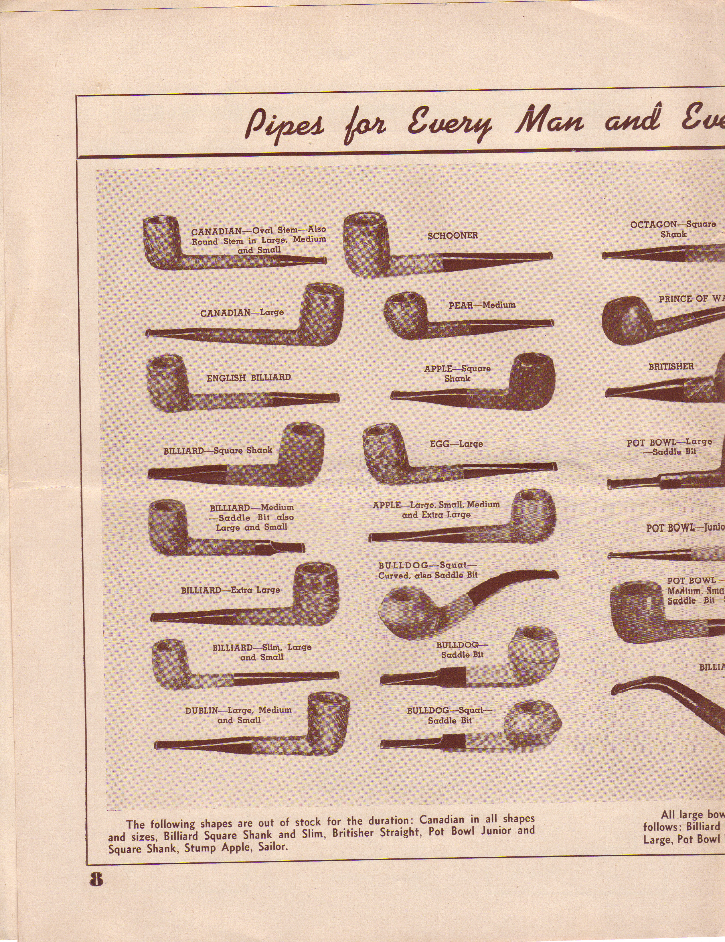 The catalog states that all pipes are either Algerian or Corsican Briar. The pipes being sold are light but color to deep brown very rapidly. Ken has not seen similar treatment. The catalog shows pipe prices ranging from $1.75 to $7.50. (Factory workers in the era made around $40/wk at the time). They are stamped either straight grain or imported briar. The catalog also indicates the shop did its own blending and had onsite repair.