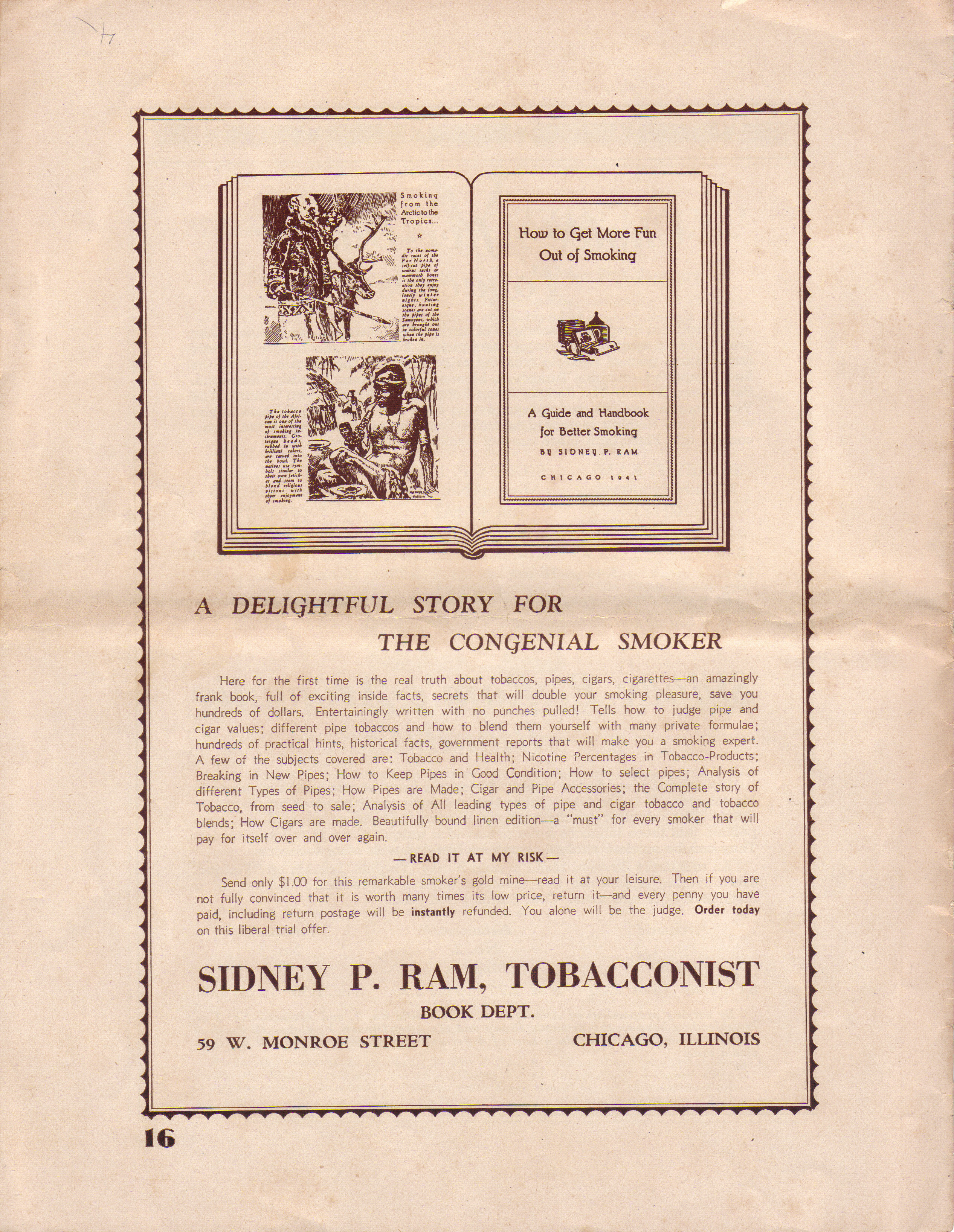 “Sydney P. Ram was a pipe maker in the 1930’s and reported to have retired in 1942. Ram’s shop was at 59 West Monroe in Chicago’s Loop. His pipes were normally simply stamped Sydney P. Ram in script. He was also the author of a book on pipe smoking in 1941 called How to get more fun out of smoking; a guide and handbook for better smoking and is sometimes available on Amazon, having been reprinted in 2011.”