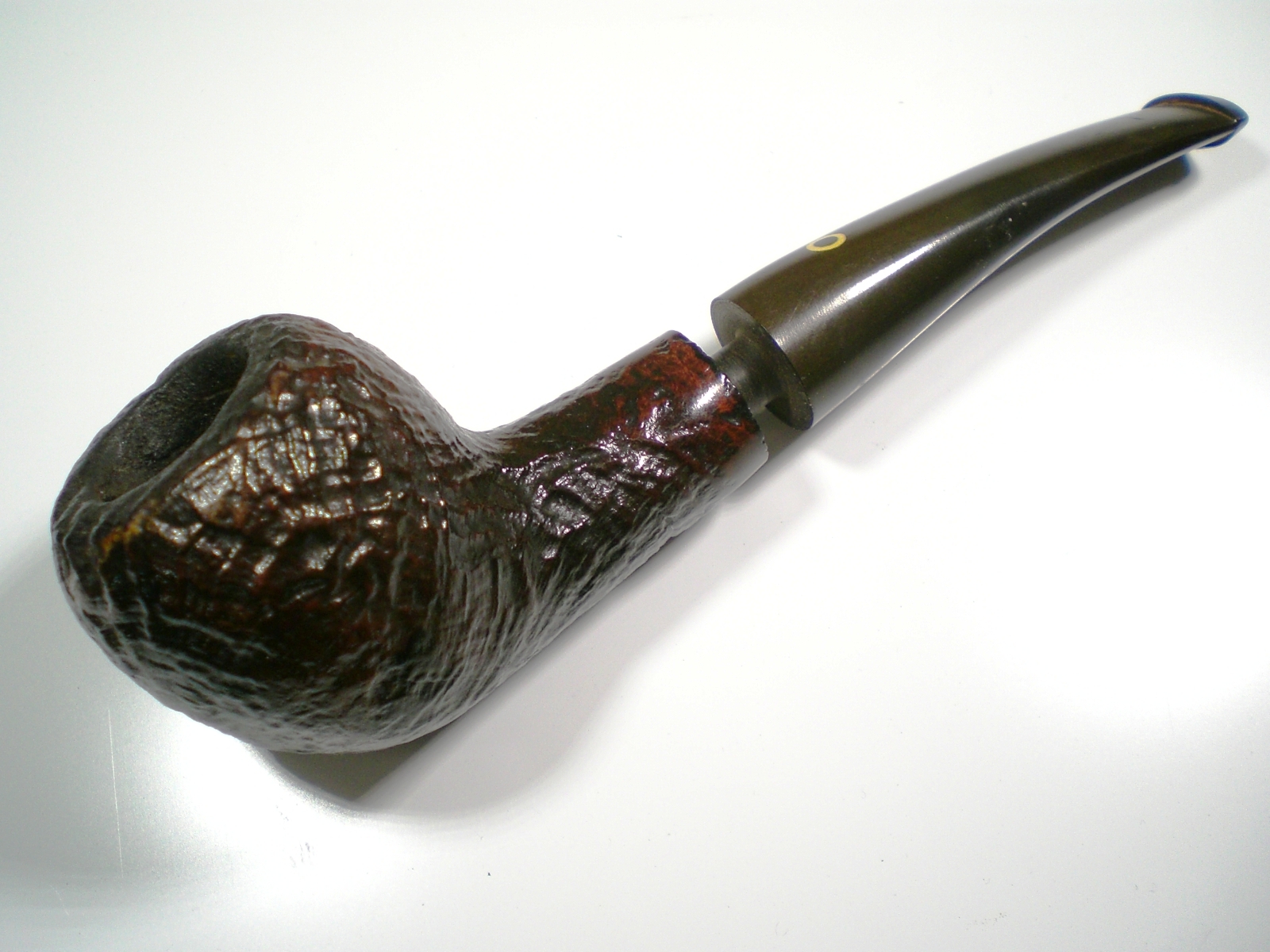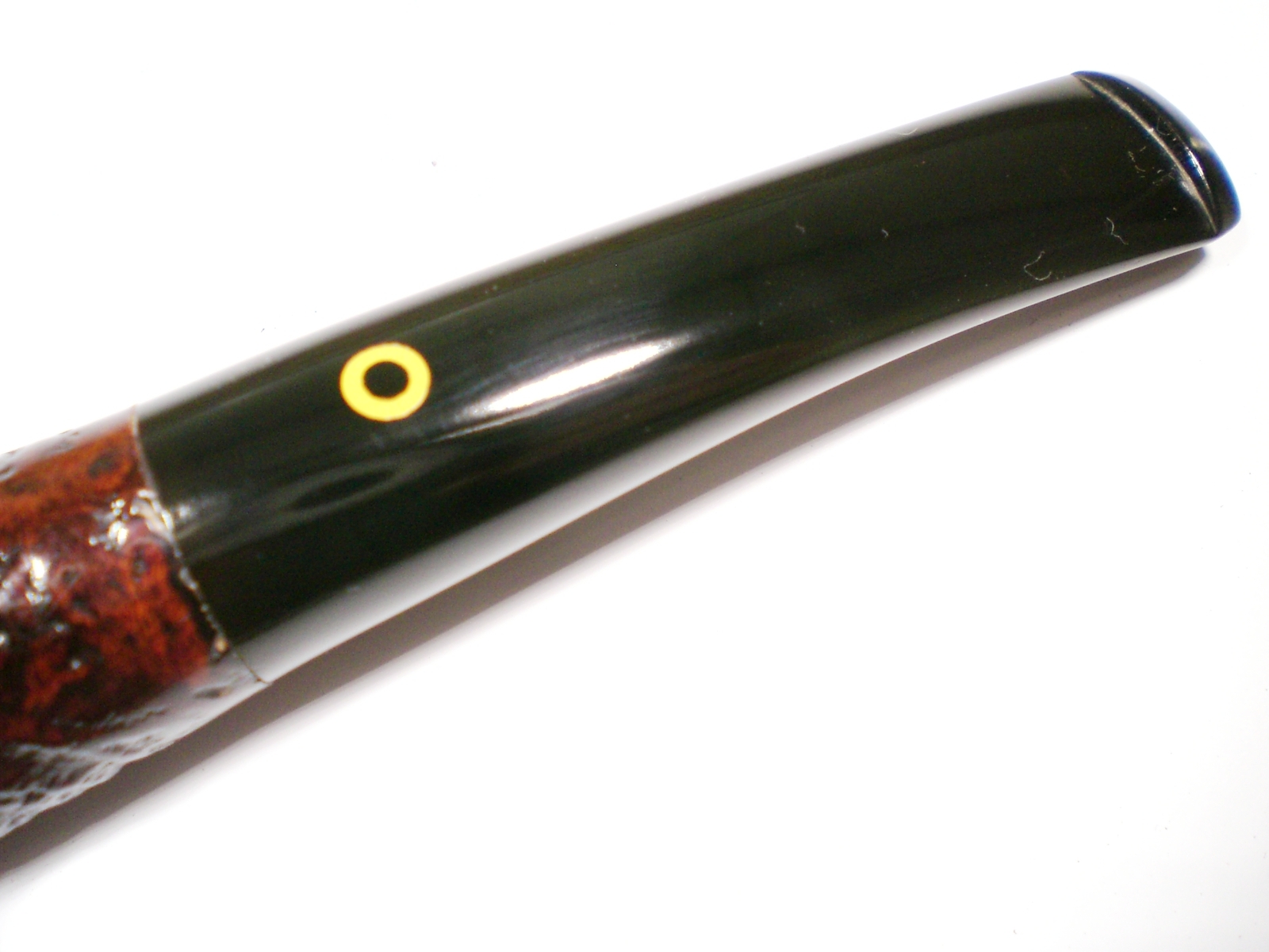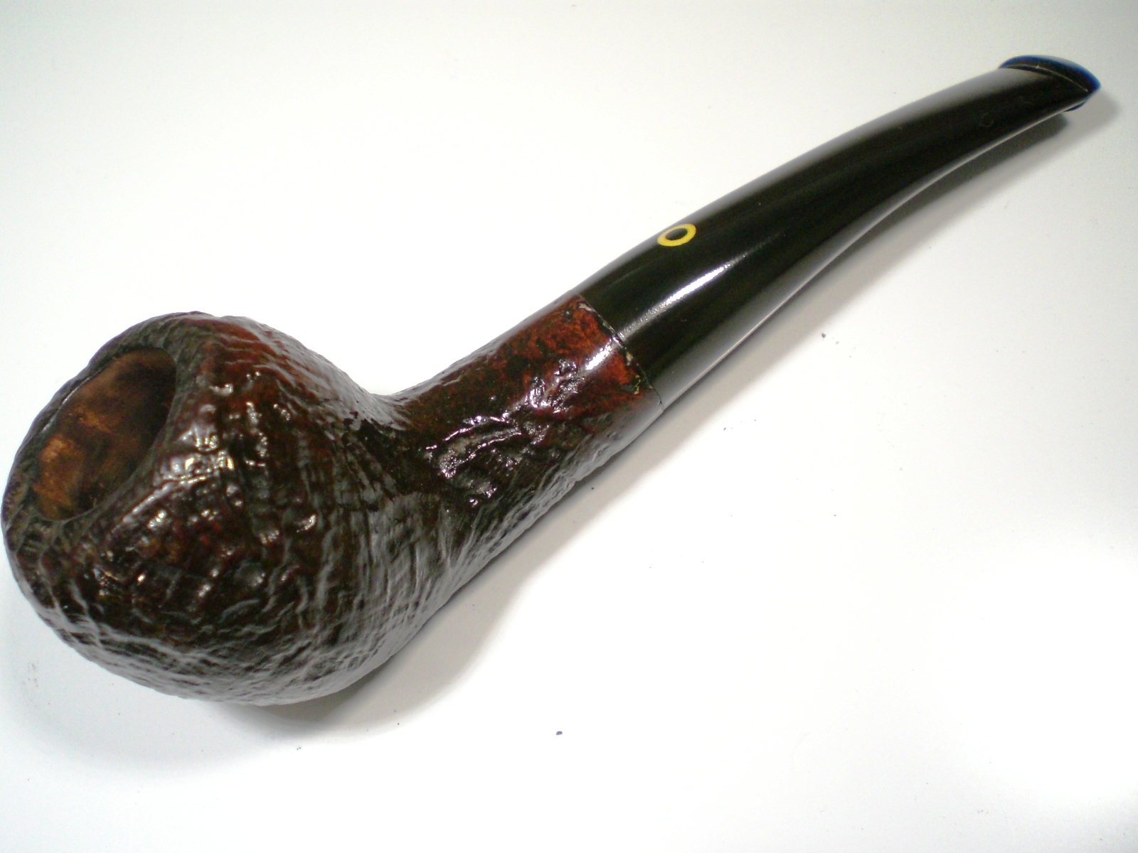 I put a dab of grease on the stem logo (which seems pretty durable) and soaked it in a mild solution of Oxy-Clean. There was a slight tooth crease on top of the stem, but it lifted nicely with a flame and was removed in the cleaning process. The stem was then mounted on the pipe and mild oxidation removed with 800>1500 and 2000 grit wet paper. I then moved to the 8000 and 12000 grade micromesh papers. The last step was to buff the stem with White Diamond and then Meguiars Plastic polish. I waxed the bowl exterior with some Paragon wax.