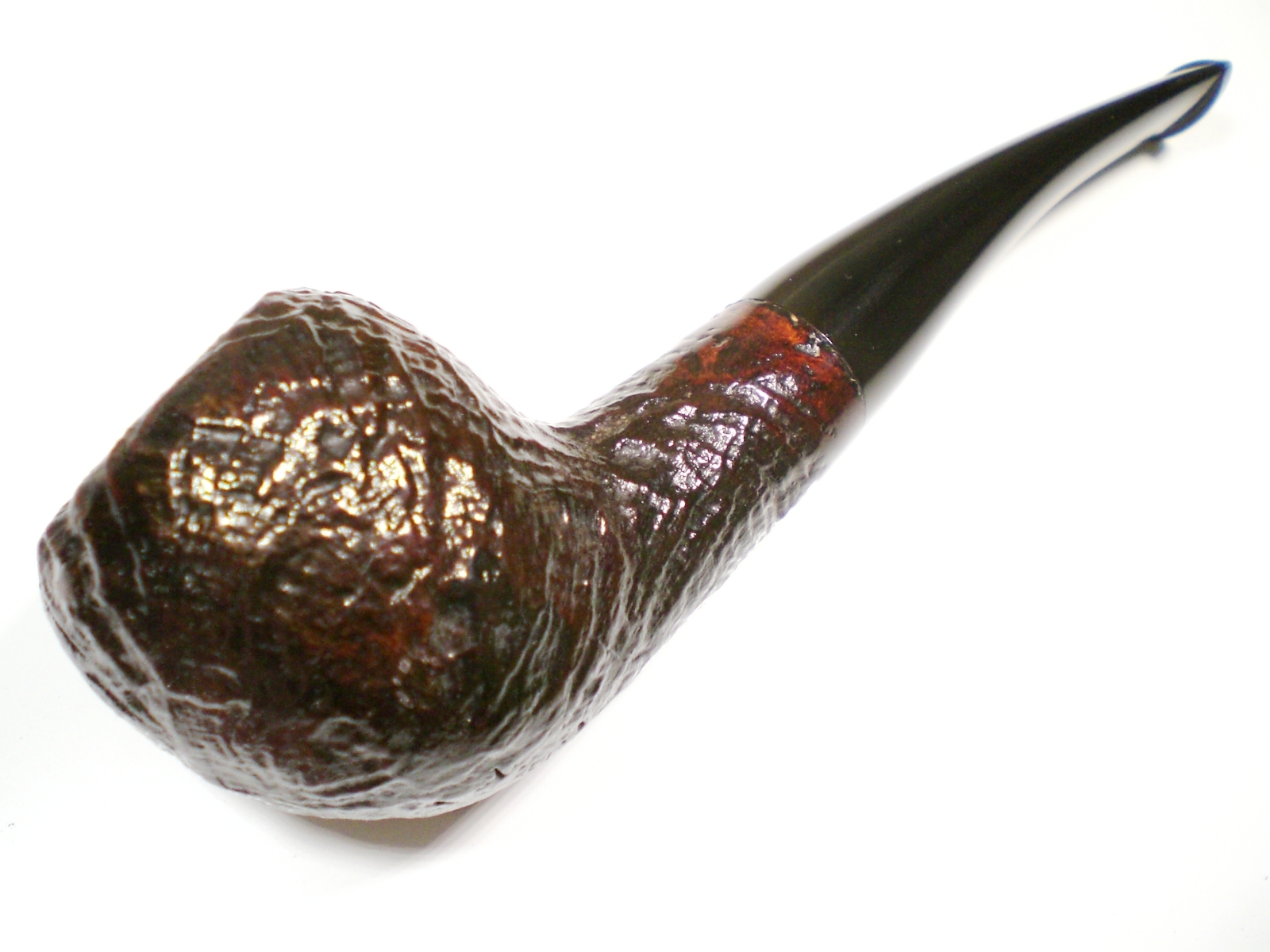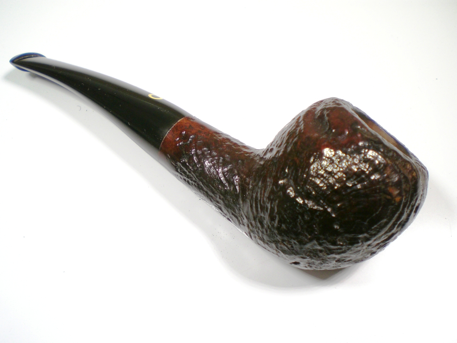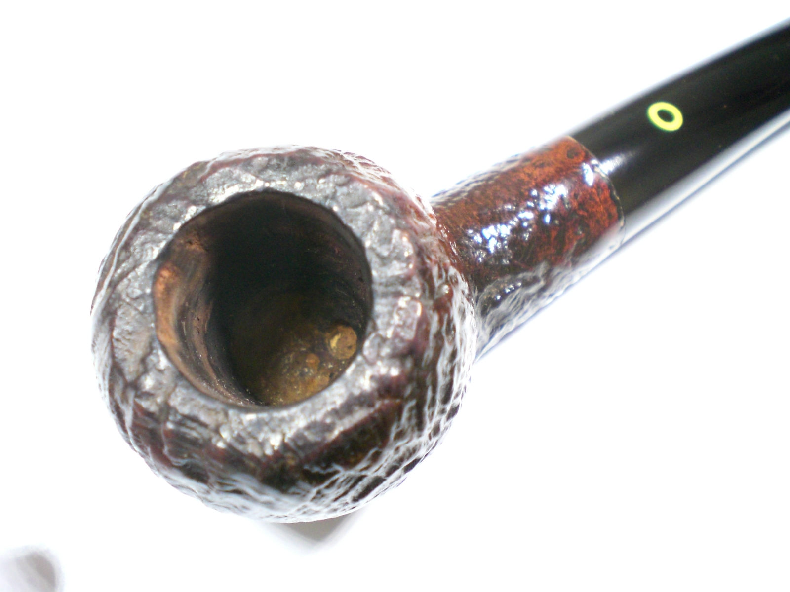 I put a dab of grease on the stem logo (which seems pretty durable) and soaked it in a mild solution of Oxy-Clean. There was a slight tooth crease on top of the stem, but it lifted nicely with a flame and was removed in the cleaning process. The stem was then mounted on the pipe and mild oxidation removed with 800>1500 and 2000 grit wet paper. I then moved to the 8000 and 12000 grade micromesh papers. The last step was to buff the stem with White Diamond and then Meguiars Plastic polish. I waxed the bowl exterior with some Paragon wax.