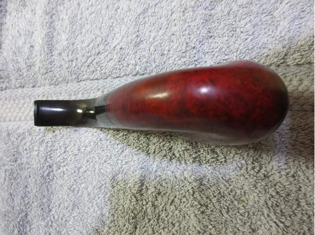 There were still some scratches that showed up in the bright light of the flash so I worked it over again with the last set of pads and then buffed it with Blue Diamond Plastic Polish on the wheel. I finished by giving the bowl and stem multiple coats of carnauba wax and then buffing it with a clean, soft flannel buffing pad to raise the shine. The finished pipe is shown below. Somehow in the photos the fluorescent lights lend the photo a yellow tint that I normally do not get. The stem is absolutely shiny and black and the bowl is a rich oxblood red. It is ready to be smoked and enjoyed.