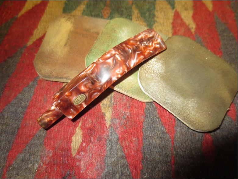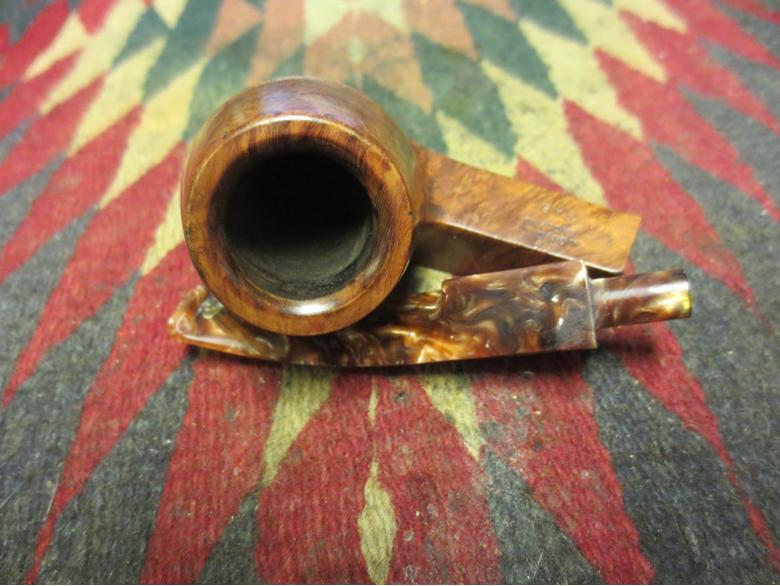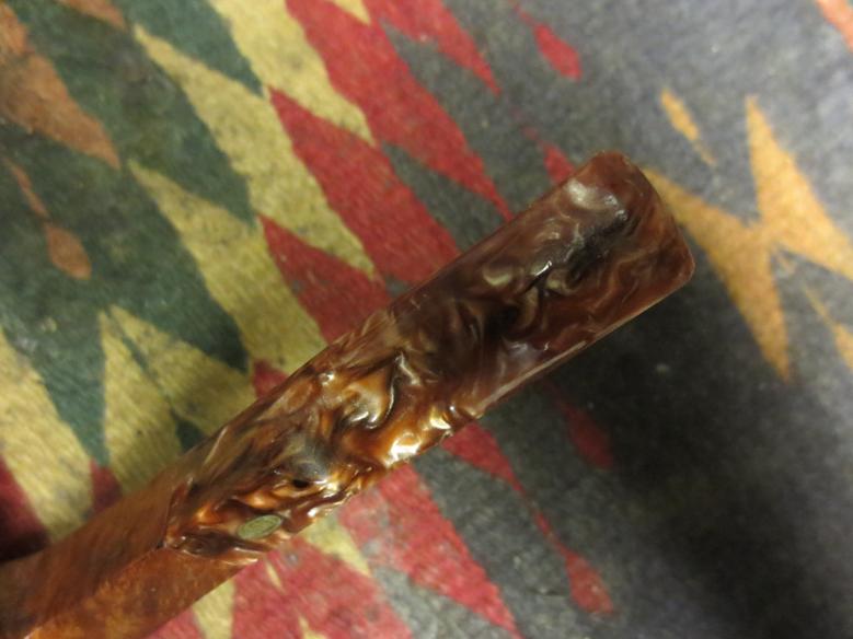 The stem was a marbled bronze as suggested in the catalogue. The sharp edge of the button had been worn down so that the button merely sloped into the end of the stem. The top side was clean and the underside had a well done repair to a bite through. It appeared to be made out of epoxy and was rock hard. There were slight dents in the surface of the repair but it was still solid.