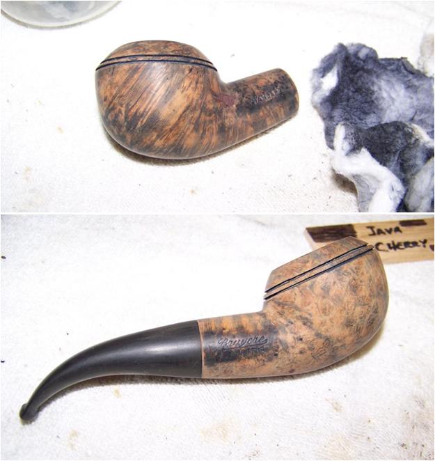 Without stain, using the natural rich color of the briar, I prepared the bowl and shank for the coming test to see if the bit worked out, the likelihood of which I had doubts, by buffing it with white Tripoli, White Diamond and two coats of carnauba, using the plain cloth buffer between each, of course.