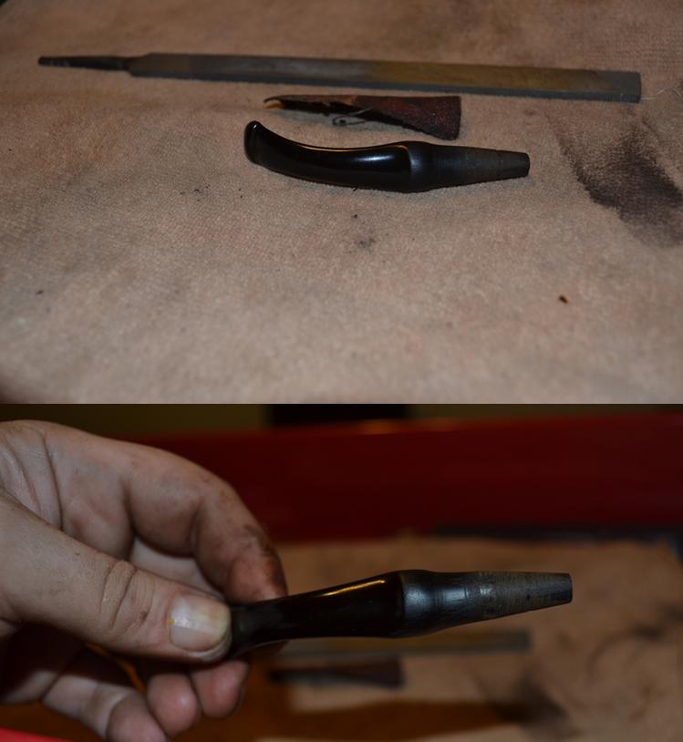 In a sentence, this restoration was more about the stem than anything else. I had decided to go with a perfect replacement from a Peterson’s Standard System pipe in my personal collection. Then, when I donned my Dollar Store 3.75X glasses for a “final” close inspection, I cringed at the sight of the faint black outline of the Peterson’s P, shown below, now filled in with a white china marker.