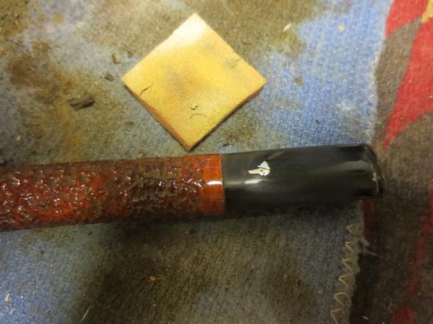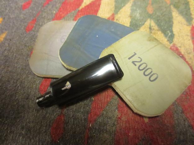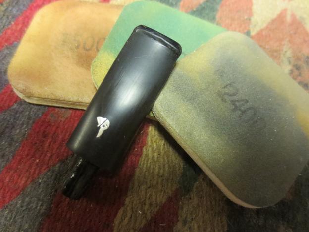 I wet sanded the stem with 1500-2400 grit micromesh pads and then used some mineral oil to give the next grits of micromesh some bite. I then dry sanded with 3200-4000 grit pads and repeated the oil and then finished with 6000-12000 grit pads. I put the stem on the pipe and buffed it with Blue Diamond.