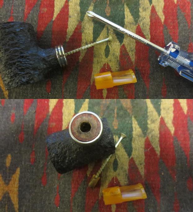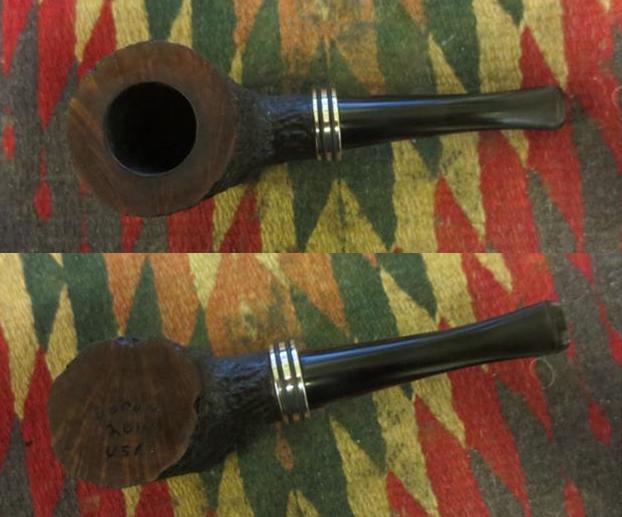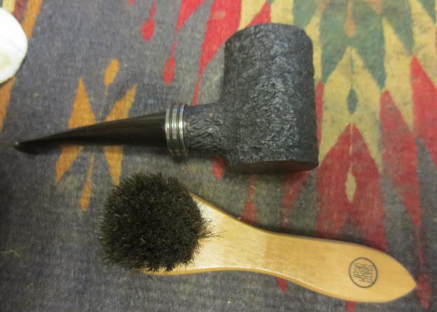 In the gift bag that I received while traveling was a poker made by Brian Doran. I did some reading on Brian’s Facebook page and cannot find out when the pipe was made. I know that this one was originally a nosewarmer poker. I had the pieces of the pipe as it had been dropped by my friend. The tenon broke off in the shank. The tenon would need to be pulled and a new tenon put in the stem or the pipe would need to be restemmed. The bowl was large and the rustication was very nice with a contrasting stain between the rim and bowl. The bowl was a dark brown/black with the smooth rim and bottom stained with a medium brown. The bowl was attractive and the drilling was spot on. There was a large silver band with two black rings around it on the end of the shank that added to the weight of the piece.Doran1 I put the stem up against the bowl to get an idea of how it originally looked before the break. The piece of briar was quite large and heavy and the small mouth piece that had been on it made gripping it a challenge. I could see why my friend had dropped it. The mouth piece itself was smaller in diameter than the shank of the pipe and did not look quite right to me. The button was rough – not sure if it happened during the drop or if it came that way. It had chips out of the edges, top and the face of the button and the inside of the slot was also roughly shaped. The shortness of the blade on the stem did not give much to work with.Doran2 I used a screw to pull the broken tenon out of the shank. I twist it in with a screwdriver until it catches and then wiggle the screw while pulling on it. It generally comes out very easily. I was thankful that this time it came out without a problem. I cleaned up the shank with pipe cleaners, cotton swabs and alcohol.Doran3 With the tenon pulled I needed to make a decision regarding the pipe. After spending some time with the mouth piece I decided that the damage to the button would take more work than I was willing to put into it. I personally did not like the short stem and found that it was uncomfortable in the mouth and the pipe was too heavy to make it practical. That meant that I needed to restem it. I looked at short stems of the same diameter – both saddle and tapered and just did not like the look. I went through my stems and found a saddle stem that was the same diameter as the shank but was not happy with the overall look. Then I found this smaller tapered stem. It was one I had scavenged from somewhere and the tenon was a perfect fit. It sat in the shank just like the little saddle stem had and showed the stained briar ring inside of the silver band. The appearance at the shank was almost the same. It was slightly bent and I would need to straighten it but I kind of liked the look. It would be worth working on. If I should decide otherwise later I can always restem it again. I set up the heat gun and straightened the stem leaving a very slight bend.Doran4 I took the next series of photos to show what the pipe looked like at this point in the process with the longer stem.Doran5
