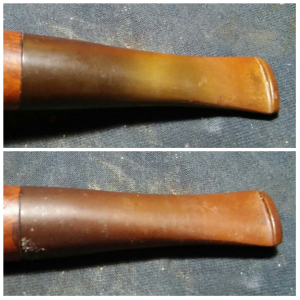 She was in rough shape when received, thick crumbling cake, stem oxidation and the tennon was glued into the mortise. Once the the glue was removed from the tennon and mortise, I realized the glue was the previous owners attempt to fix a loose fitting stem. In my excitement Christmas morning I had already removed the glue. Using EverClear I filled the chamber and left it to soak, eventually I was able to free the…