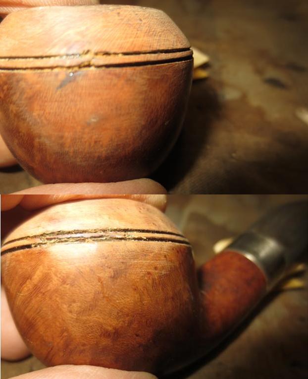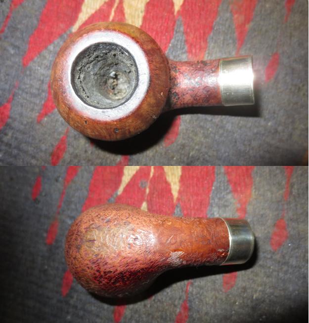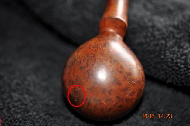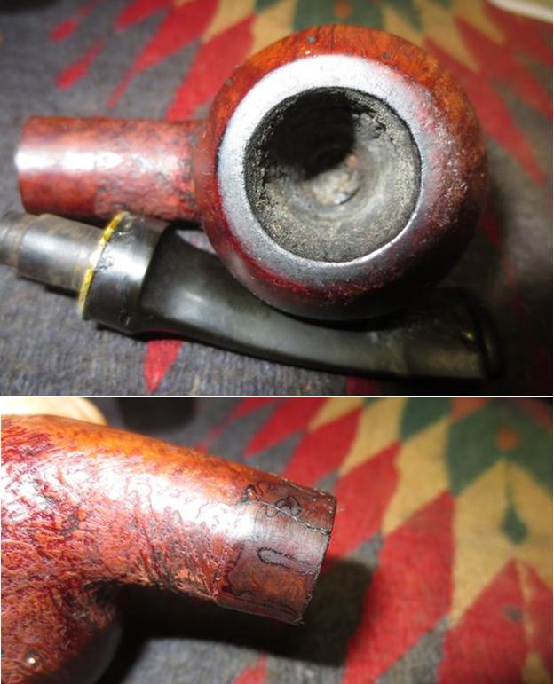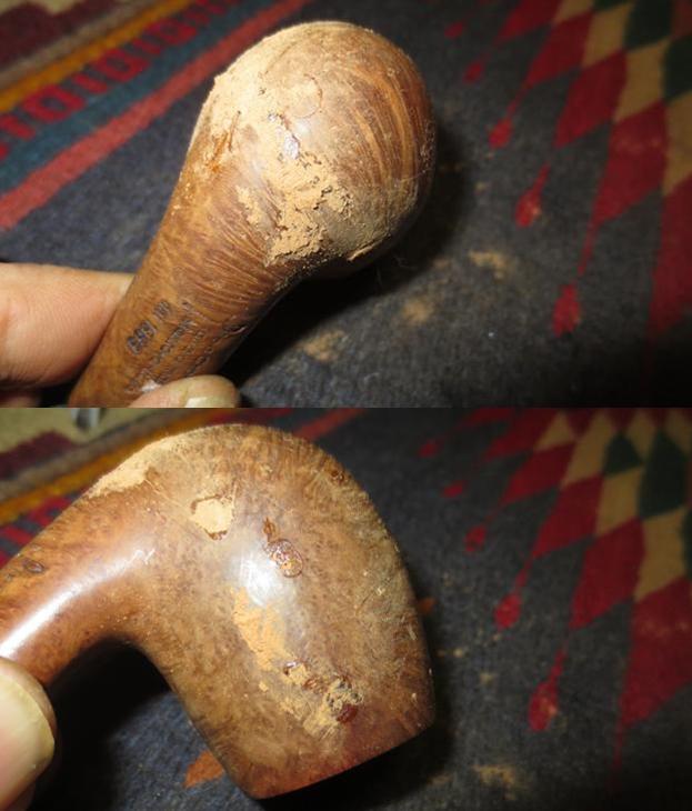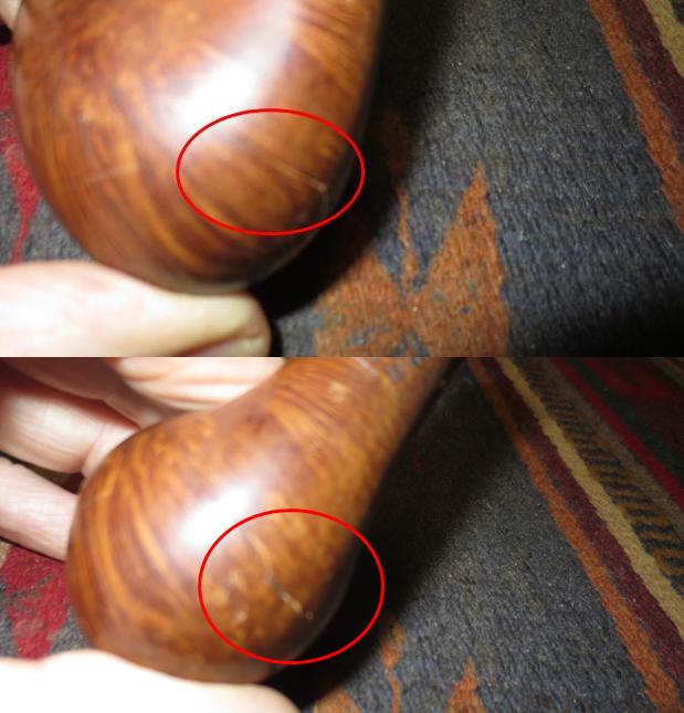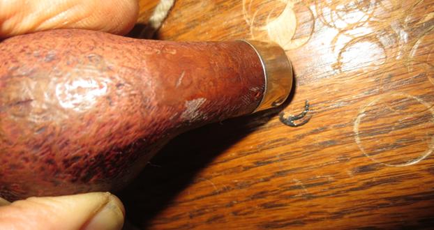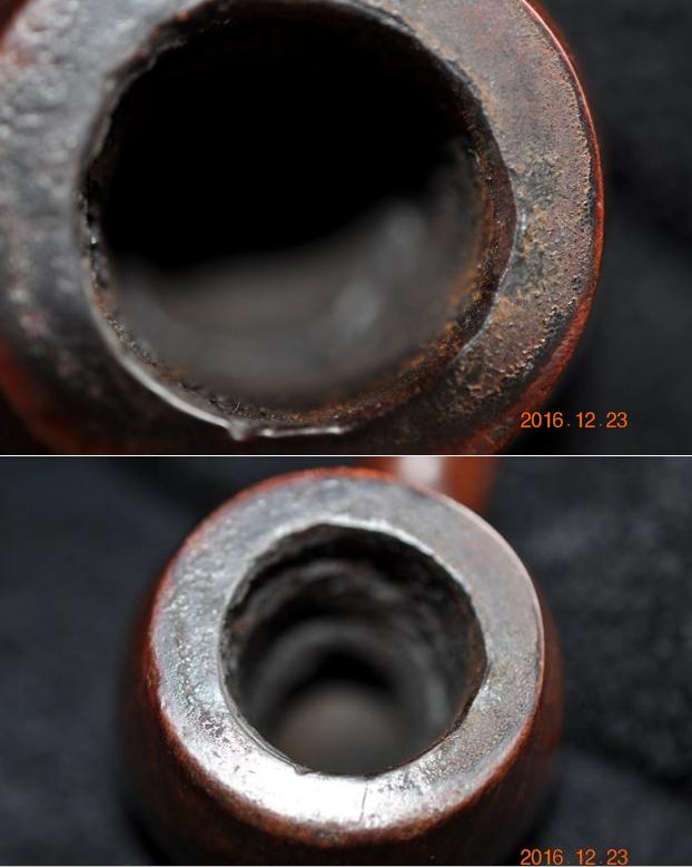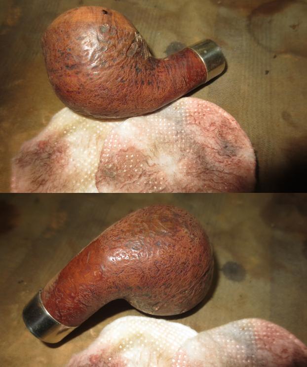 I now use undiluted Murphy’s Soap with cotton pads, a bristled tooth brush and a brass wired brush to clean the stummel surface, scrub the rim and clean the grime out of the twin grooves. As I’m cleaning, it becomes evident that the left front of the upper dome is scorched from what appears to be the aftermath of using a lighter flame over the side of the rim to light the tobacco. I do not use a lighter for this reason – it is difficult to angle the flame without bringing damage to the surface briar. I use matches and bring the flame directly over the chamber and draw the flame directly to the tobacco. I’ll need to send Jon a note about this!!! After scrubbing with all available tools, I rinse the stummel with tap water without introducing water into the internals. With the rim now clean, the extent of the damage is revealed. The final picture in the set below, on the lower part of the picture shows this damage.