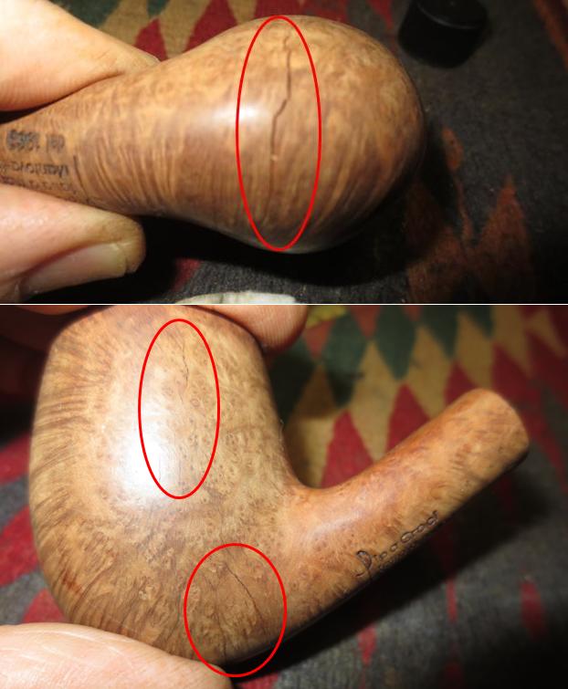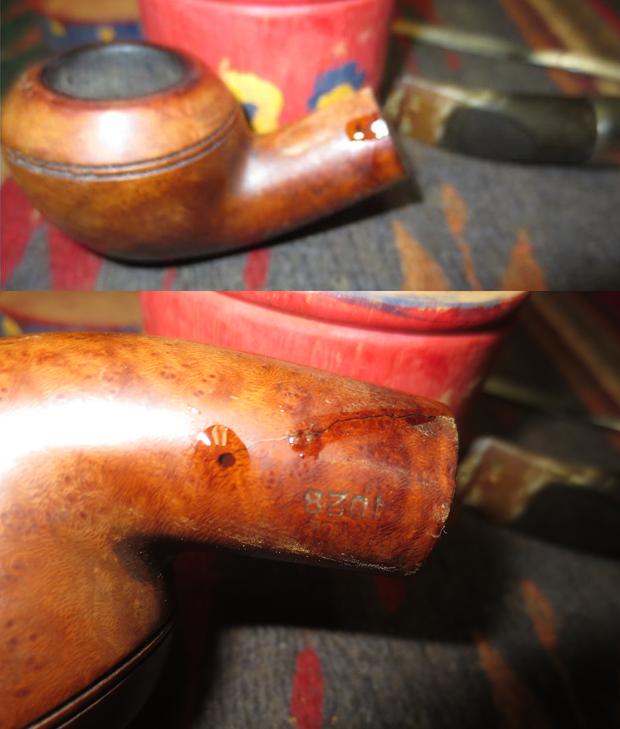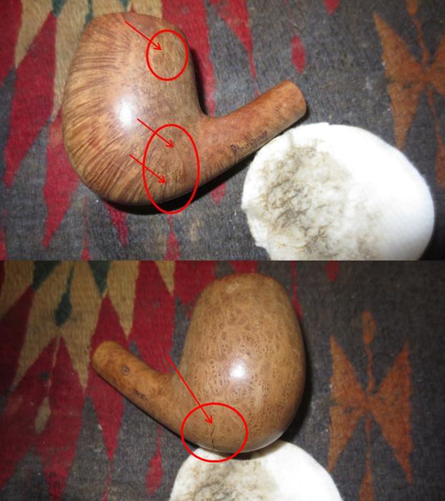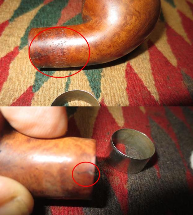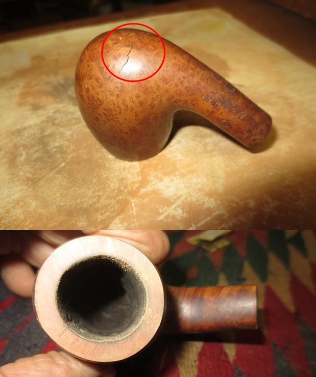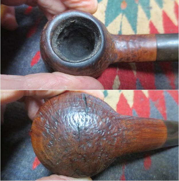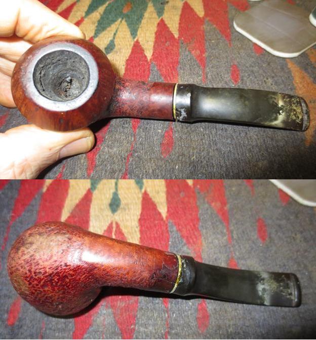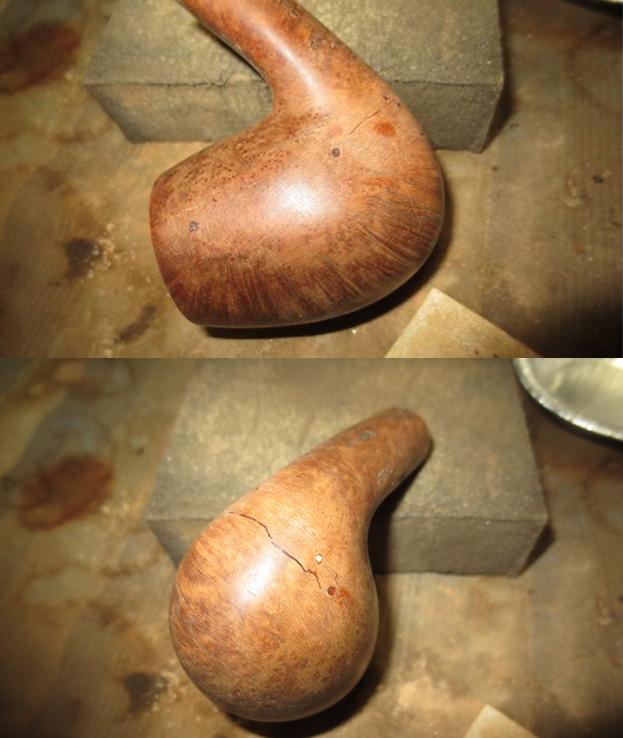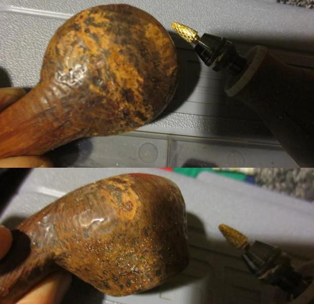 I now use undiluted Murphy’s Soap with cotton pads, a bristled tooth brush and a brass wired brush to clean the stummel surface, scrub the rim and clean the grime out of the twin grooves. As I’m cleaning, it becomes evident that the left front of the upper dome is scorched from what appears to be the aftermath of using a lighter flame over the side of the rim to light the tobacco. I do not use a lighter for this reason – it is difficult to angle the flame without bringing damage to the surface briar. I use matches and bring the flame directly over the chamber and draw the flame directly to the tobacco. I’ll need to send Jon a note about this!!! After scrubbing with all available tools, I rinse the stummel with tap water without introducing water into the internals. With the rim now clean, the extent of the damage is revealed. The final picture in the set below, on the lower part of the picture shows this damage.