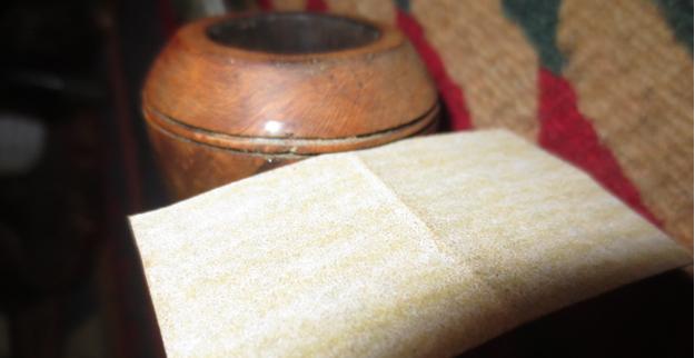 Following the Tripoli compound, I mount a cotton cloth buffing wheel dedicated to Blue Diamond compound. With the Dremel remaining at its slowest speed I apply the lesser abrasion of Blue Diamond compound to buff the surface preparing it for the carnauba wax application. I reunite the squared tapered stem to the stummel and apply Blue Diamond compound to both. I know this borders on eccentricity, but as I was finishing the Blue Diamond cycle, I notice that the rim patch done earlier was showing a ridge around the patch, and not flush with the rim. A bit late in the game to notice this, but it won’t do. Very strategically, I roll a piece of 600 sanding paper and address the ridging. I follow with the full set of 12 micromesh pads folded and strategically addressing the area. Finally, I apply a dark brown stain stick and lightly wipe a cotton pad wetted with isopropyl 95% to blend the area. Finally, I run the Blue Diamond wheel over the rim and I’m back to where I started. The patch is visible, but now without the ridges that draw attention to the repair. Now, the rim is smooth to the touch. Much better. Before and after pictures follow this small detour!