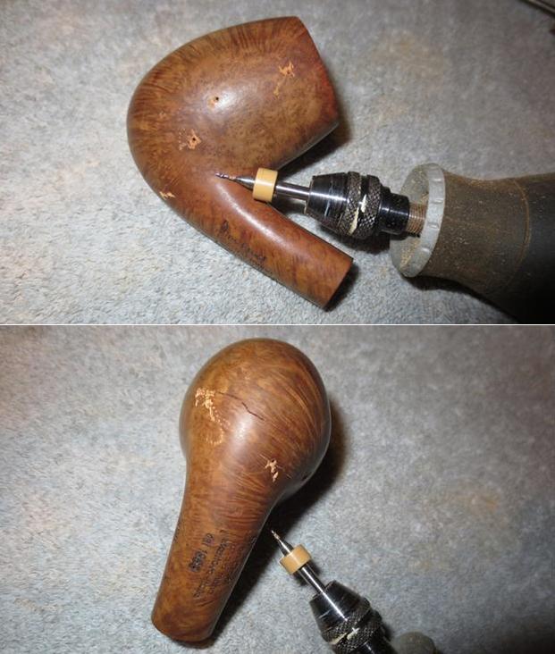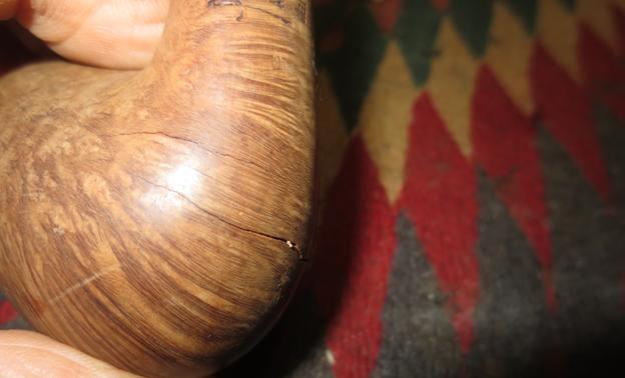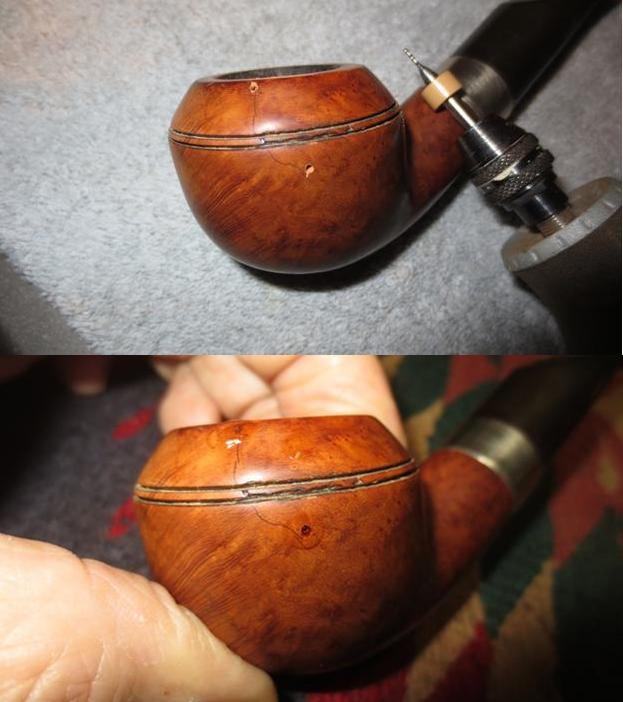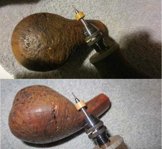 The next morning, the stummel is waiting to be unwrapped of the flamed crust. Using the Dremel high speed rotary tool, my tool of choice given the tight quarters of my work table on the 10th floor of a former Communist block apartment building, I mount a felt buffing wheel set at the slowest speed, and use Tripoli compound to apply the gentle abrasion to begin the final buffing stages. I first purge the wheel of old compound running it against the metal adjustment wrench, then with new compound on the wheel, I apply it to the surface. I do not use much downward pressure but allow the speed of the wheel’s RPMs and the compound to do the work. I methodically move over the stummel surface in areas with the sheen of the overhead lamp providing the ‘headlights’ letting me know to spread the compound or apply more to the wheel. I take a picture to show the felt wheel application of Tripoli compound – I had to stage it because I don’t have enough hands to take a picture and hold stummel and Dremel! After completing the Tripoli cycle, I lightly wiped the stummel with a cotton pad wetted with isopropyl 95%, not wanting to lighten the hue but to blend certain areas on the heel and shank. I avoid wiping down the bowl area – it looks good. Dark enough to mask repairs but on the lighter side to show the striking straight grain definitions.