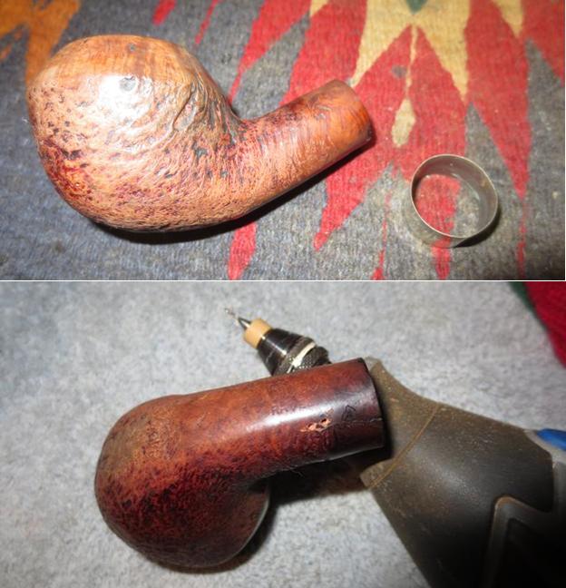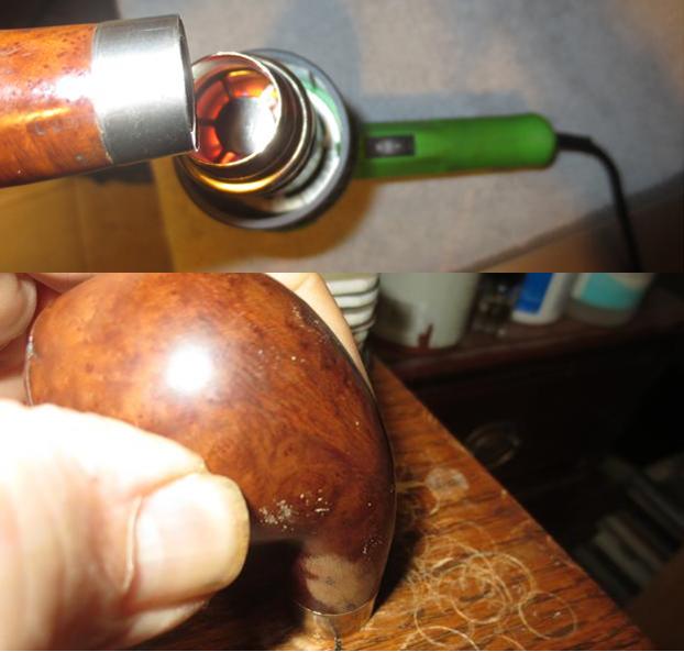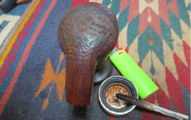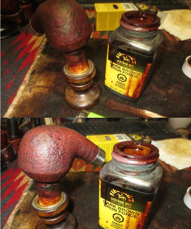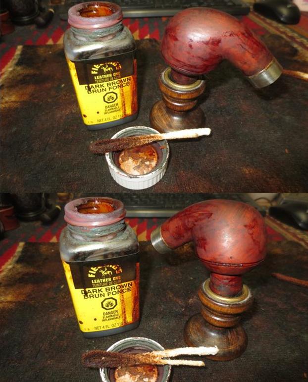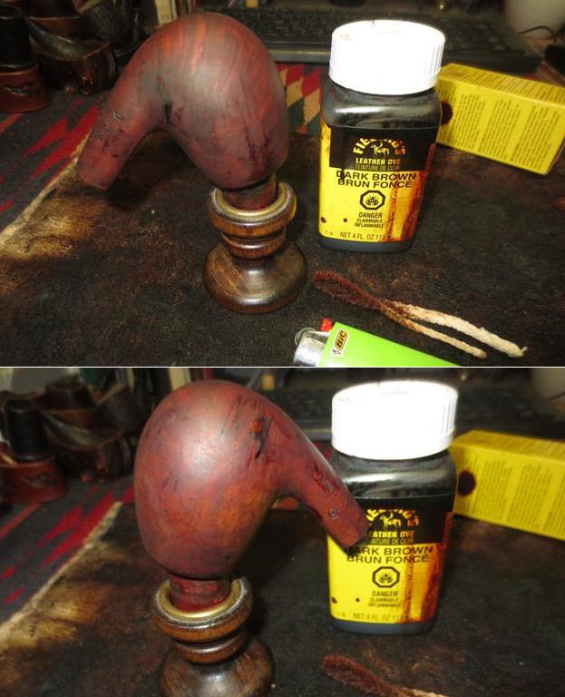 To stain, I use Fiebing’s Dark Brown Leather Dye mixed with isopropyl 95% at 50/50. I use a large dropper to do the mixing in a shot glass. With the mixture ready, I heat the stummel using the air gun expanding the briar making a better receptor for the dye. When heated, I use a doubled-over pipe cleaner to apply the dye to the stummel surface. I apply the dye liberally seeking to achieve 100% coverage. When completed, I fire the wet dye which immediately ignites the alcohol in the dye, setting the hue in the grain. I repeat the above application of dye and flaming after a few minutes. I put the stummel aside to rest for several hours before removing the fired dye crust. The pictures show the set-up and the progress.