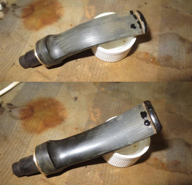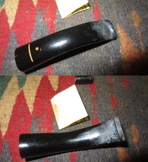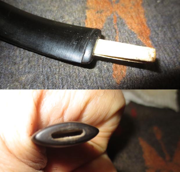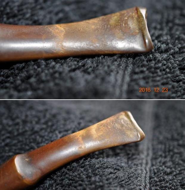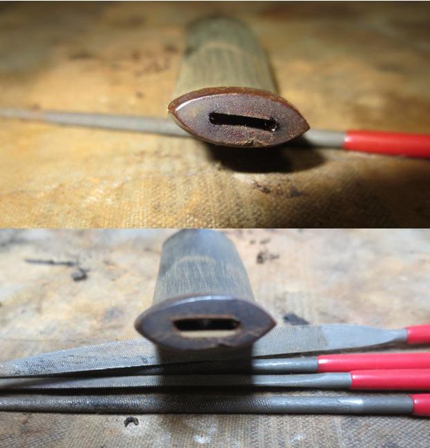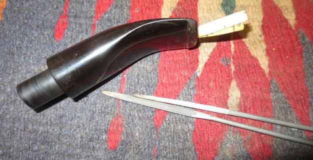 Turning to the internals of the stem, I use pipe cleaners dipped in isopropyl 95% to clean the airway. I notice that the pipe cleaners have difficulty passing through the slot so I widen it a bit using a rounded needle file against the upper and lower slot opening. That did the trick. Pipe cleaners move freely and now, cleanly. Pictures show the progress.