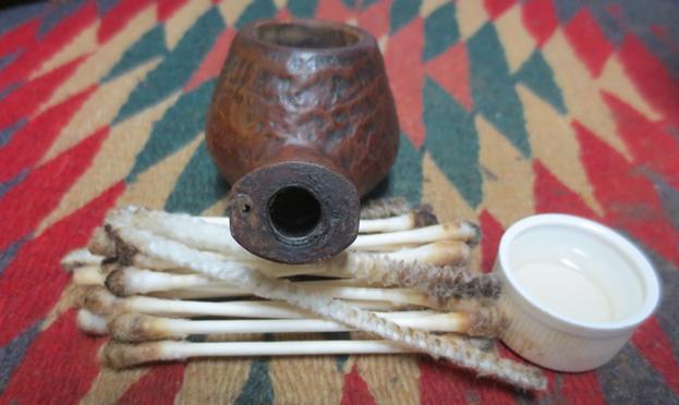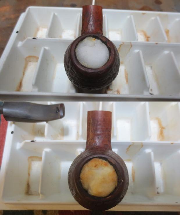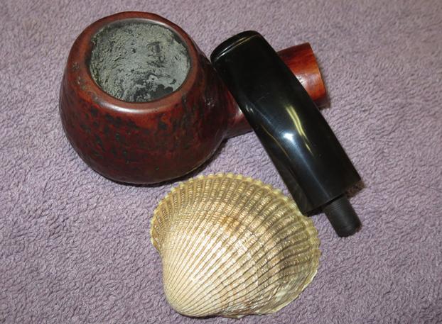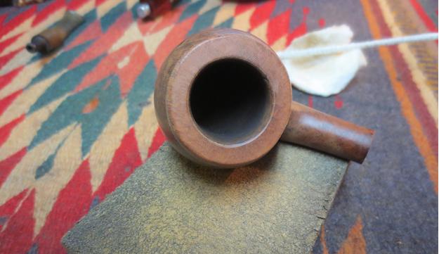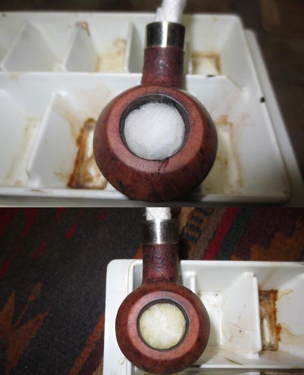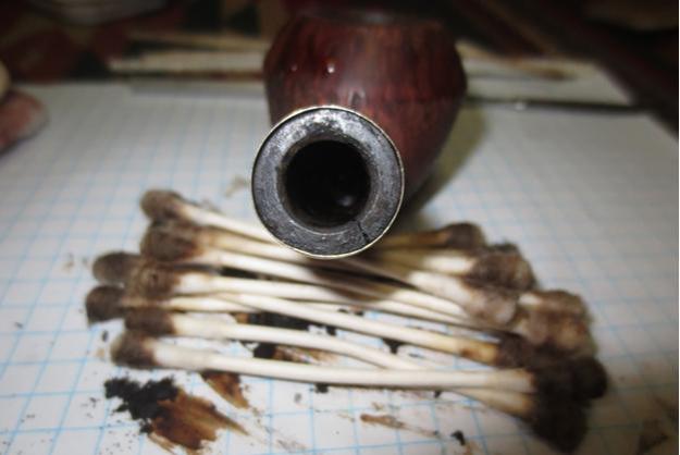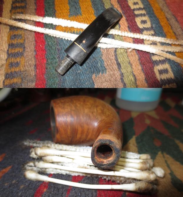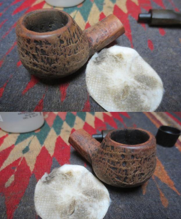 The next morning the salt, as expected had discolored somewhat and the cotton served as a wick drawing oils and gunk out of the stummel internals. I follow with a barrage of pipe cleaners and cotton swabs to finish the cleaning job. The pictures show the progress.