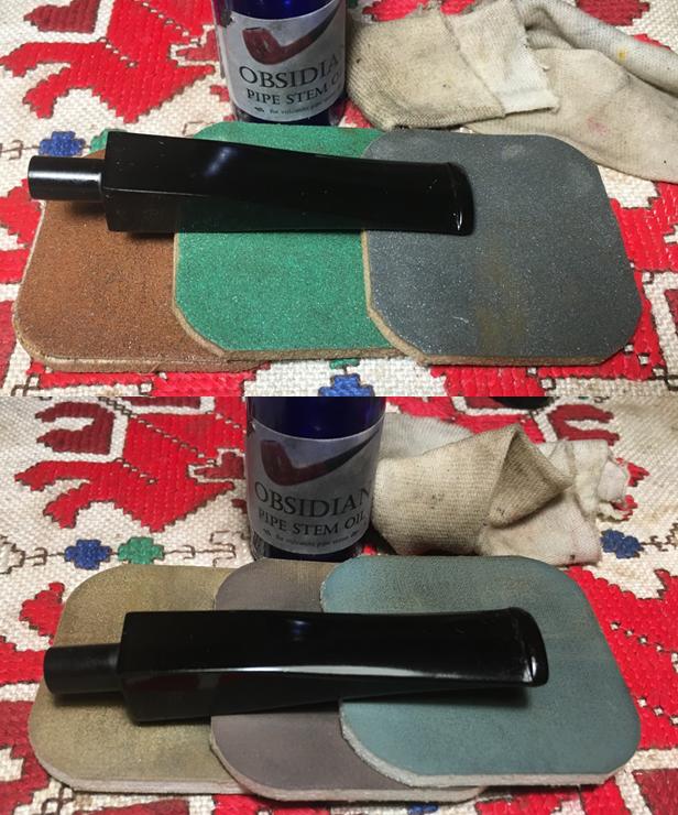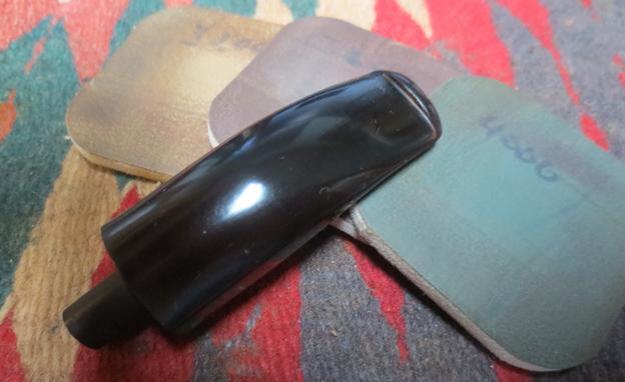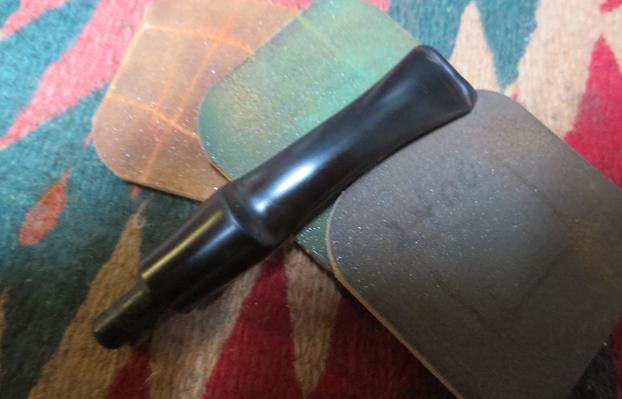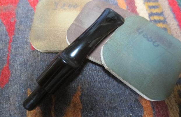 With the stem repairs completed and the internals cleaned, I’m ready to commence the micromesh pad cycle on the LJ Peretti’s squared shank. Using pads 1500 to 2400 I wet sand the stem. I follow by dry sanding with pads 3200 to 4000 and then 6000 to 12000. With each set of 3 pads I apply Obsidian Oil to the stem which revitalizes the vulcanite. The pictures show the amazing vulcanite ‘pop’ emerging. I put the stem aside to dry.