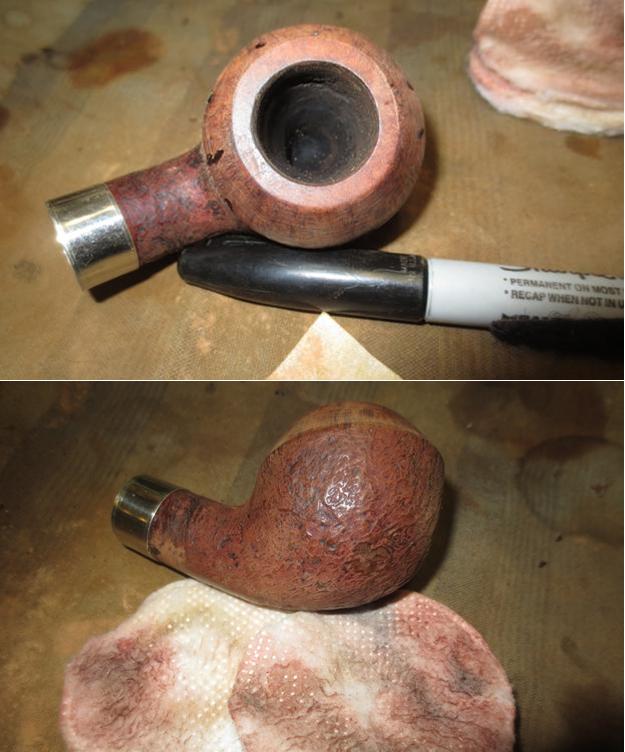 In preparation for the staining phase, I use a sharp dental probe and run it through the grooves to dislodge any briar dust from the sanding process. There is a good bit of compressed residue coming loose. I follow by wiping down the stummel with a cotton pad wetted with isopropyl 95% to clean the surface. On the stummel heel, I detect one lightened fill. I darken it with a stain stick to encourage blending. I also touch up the patch fill on the rim to help blending and masking the patch after dye is applied. Pictures show the preparation steps.