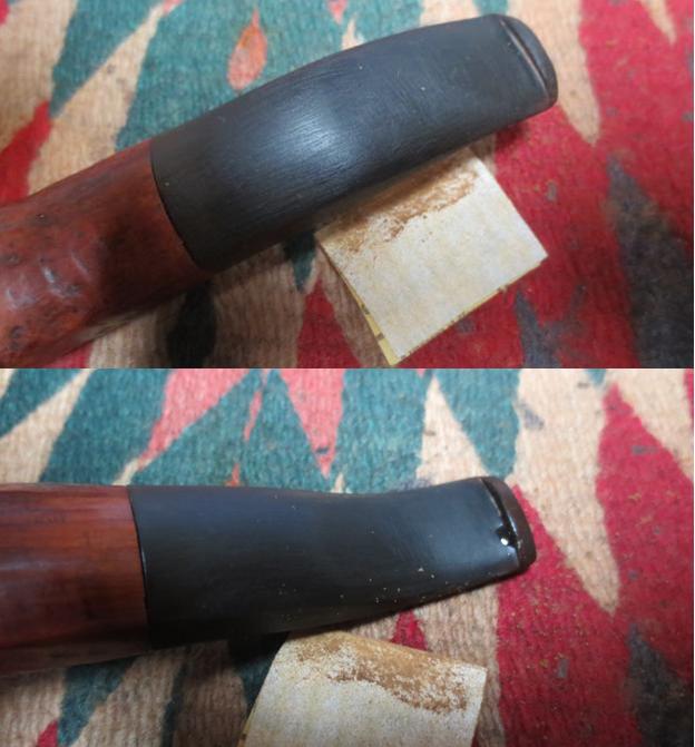 With the stummel resting, I restore the Peretti’s classic stem ‘P’ with white acrylic paint. Restoring the stem stamping for me is special, along with guarding the nomenclature – and is why I went through a stem-splice with my first Peretti restore – to save the surviving saddle stem piece with the old, warn ‘P’ stamp. I apply white acrylic paint to the ‘P’ in a large gob over the area to allow the paint to fully saturate the ‘P’ imprint. I allow it to dry fully. Later, when dried (it doesn’t take long), I use the edge of a toothpick and gently scrape the area removing the excess but leaving the paint in the stamp imprint. Using the side of the toothpick has worked for me as it is a harder surface, yet soft as it’s wood. The flat area of the toothpick passes over the stamp and does not disturb the paint. I’m pleased with the results.