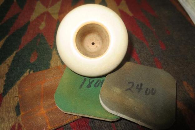 I started by working on the meerschaum bowl. I sanded out the scratches and marks with a well-worn piece of 220 grit sandpaper and then polished it with micromesh sanding pads. I wet sanded the bowl top and edges with 1500-2400 grit sanding pads. I dry sanded it with 3200-12000 grit pads. I buffed it with Blue Diamond on the buffing wheel to polish out the remaining scratches.