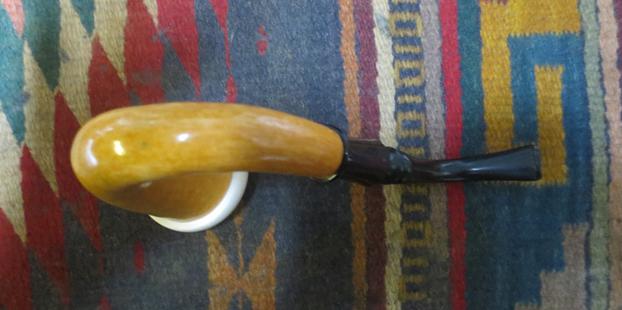 I took a close up photo of the meerschaum bowl. You can see the darkening from the lighting of the pipe and the scratches in the surface of the bowl top. The inside of the bowl is darkened. The second photo shows the underside of the bowl. It is also slightly darkened. Overall the bowl looks to be in decent shape.