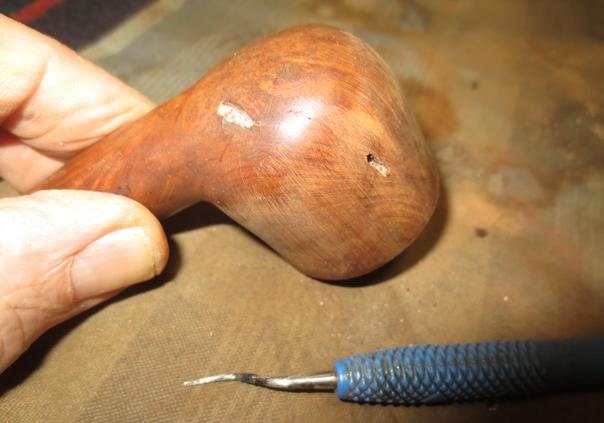 - He had mentioned a crack on the left side of the bowl. The noted crack was definitely there. It was on the left side toward the front. It is a hairline crack that starts at a putty fill toward the top of the bowl and ran down to another putty fill on the bottom of the bowl. This is one time where fills actually worked in my favour. I repair cracks all the time by drilling a small pin hole at each end to stop the crack from spreading. In this case the fills did just that for me. Go figure. I would need to simply pick out the old putty and repair the fills or top them up with super glue and briar dust.