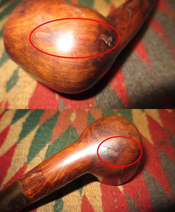 - He had mentioned a crack on the left side of the bowl. The noted crack was definitely there. It was on the left side toward the front. It is a hairline crack that starts at a putty fill toward the top of the bowl and ran down to another putty fill on the bottom of the bowl. This is one time where fills actually worked in my favour. I repair cracks all the time by drilling a small pin hole at each end to stop the crack from spreading. In this case the fills did just that for me. Go figure. I would need to simply pick out the old putty and repair the fills or top them up with super glue and briar dust.